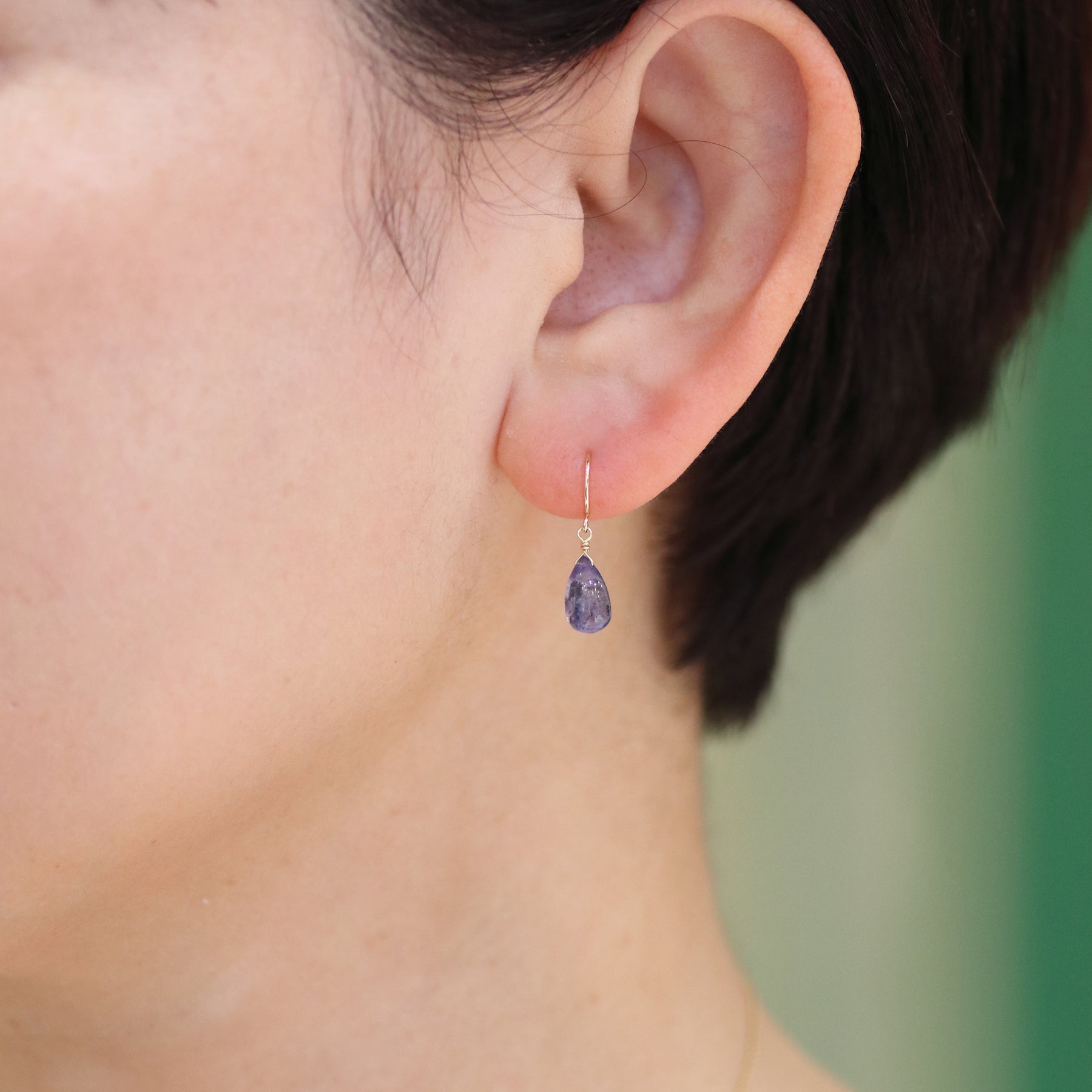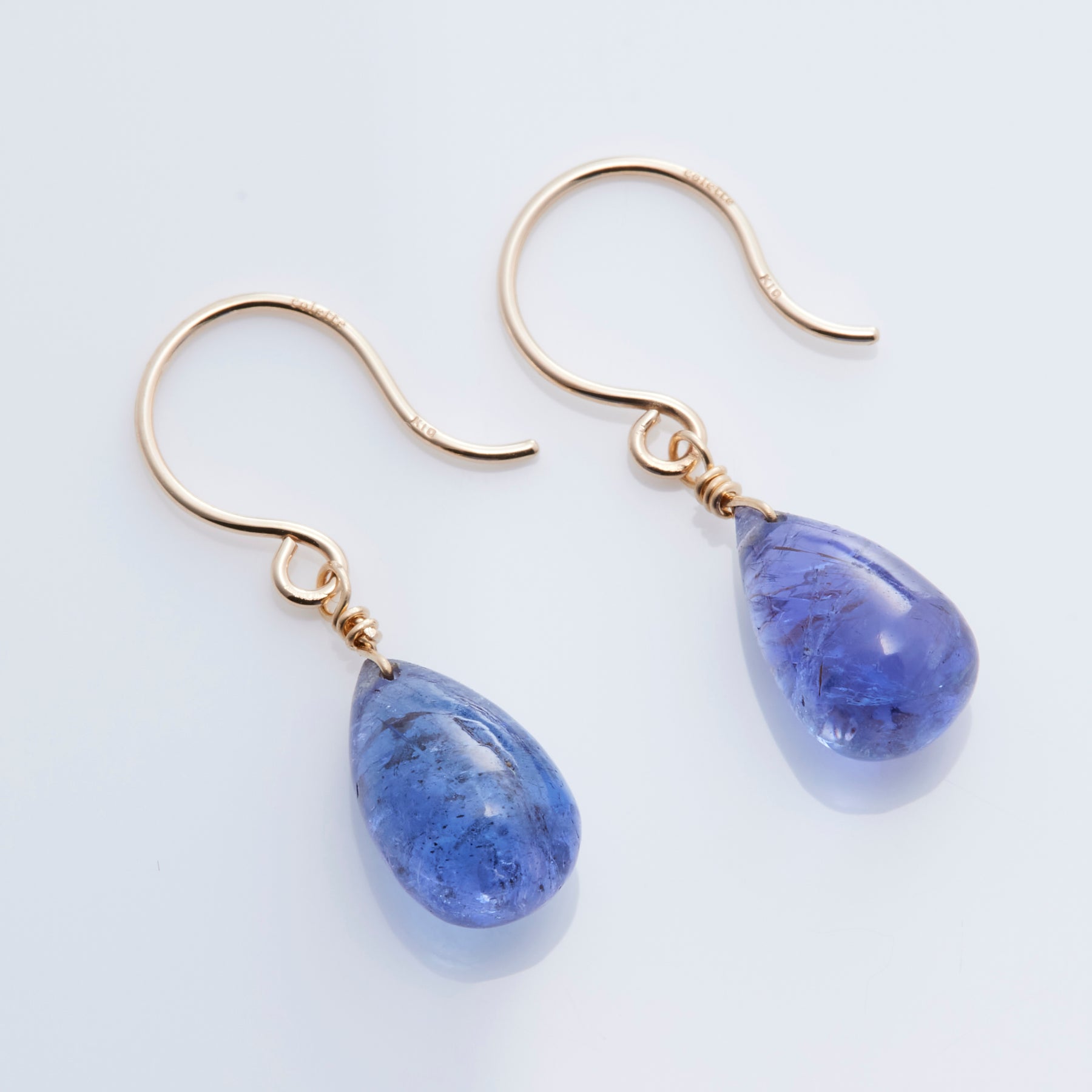 透明感のあるすみれ色が美しい12月の誕生石タンザナイトのピアス。石言葉は「冷静・神秘・成功」です。シンプルなプレーンカットのしずく型が首元に馴染みます。タンザナイトは自然光の下では透明感に満ちた美しい群青色、ライトの下では高貴な紫色に輝く希少な天然石です。