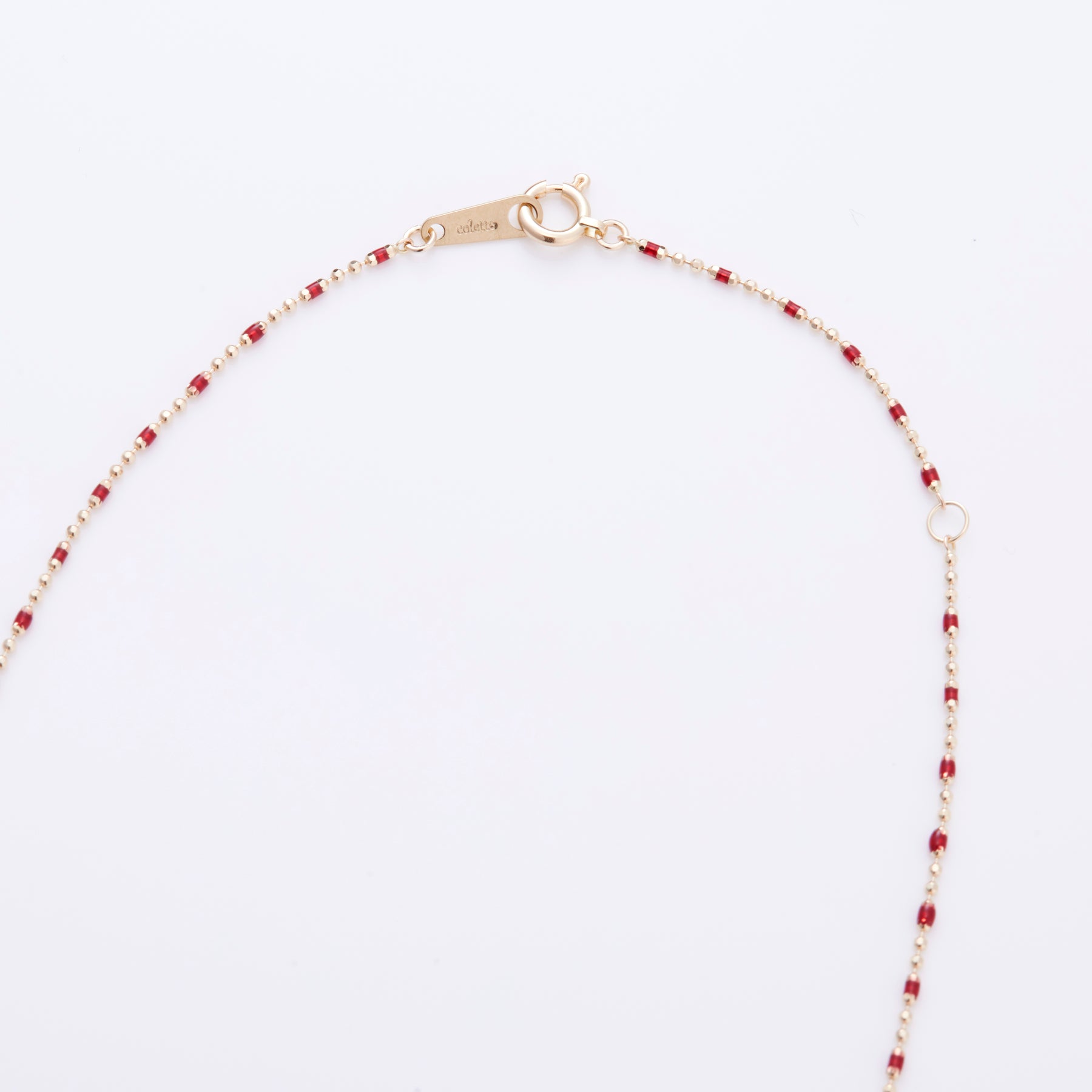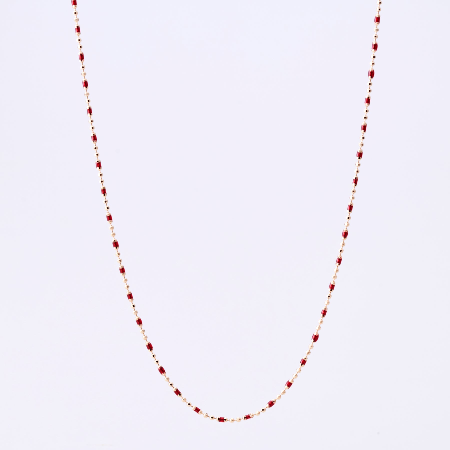 ツブツブとまるでカラーストーンがついているかのようなルミネボールチェーンネックレス。落ち着いたガーネットの色合いをイメージしてデザインしました。コレットのボールチェーンに特殊樹脂でお色を付けています。また天然石とは違った表情が楽しめるネックレスです。重ね付けはもちろん、1本でシンプルにつけられてお顔回りを明るくみせてくれそうです。