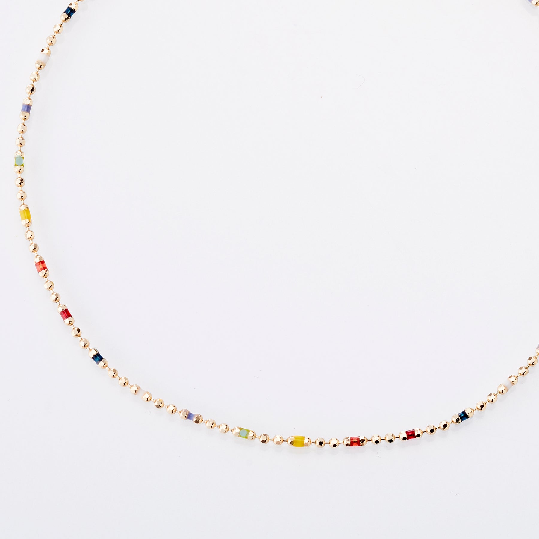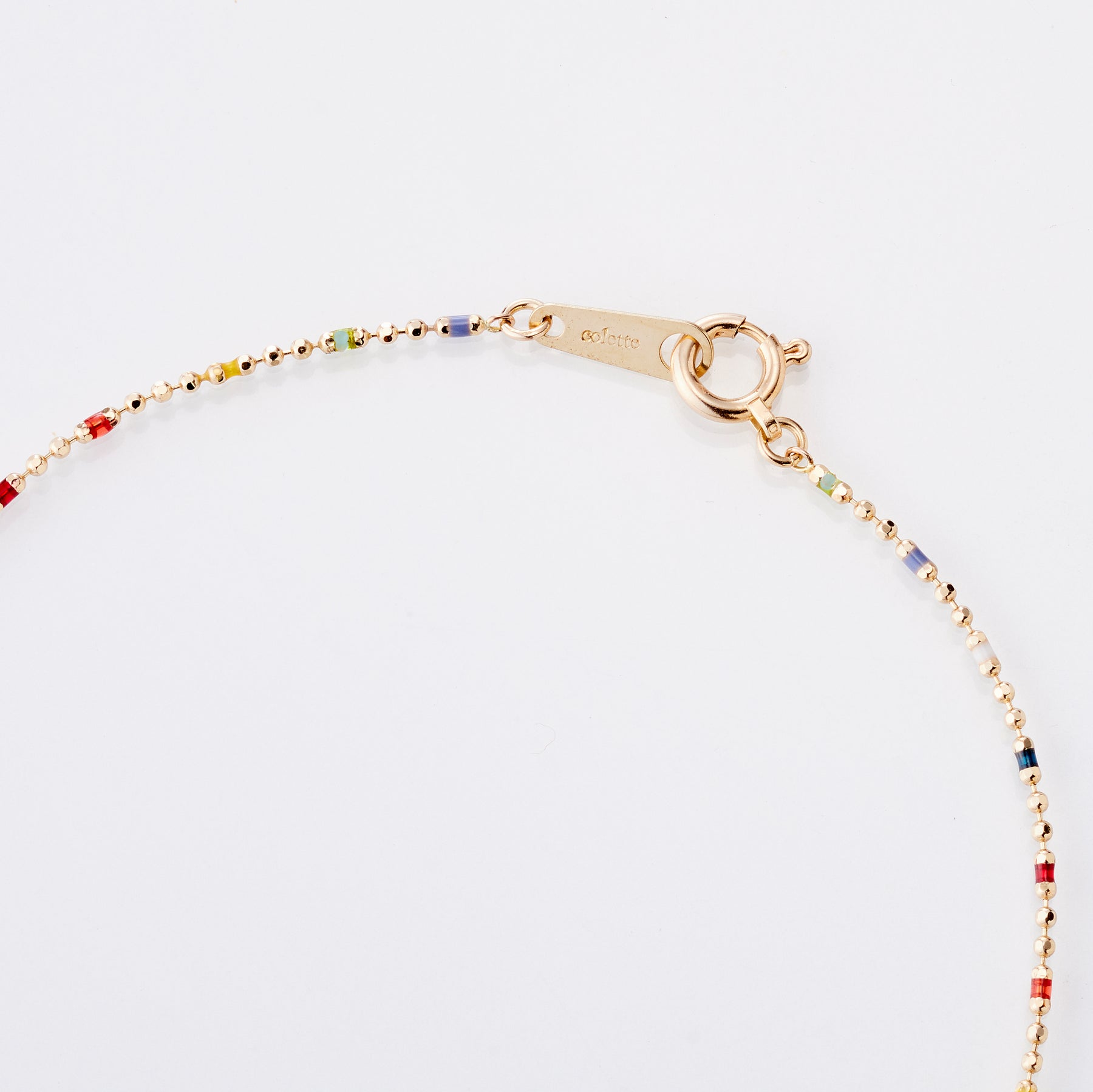 ツブツブとまるでカラーストーンがついているかのようなルミネボールチェーンブレスレット。繊細なデザインのコレットのボールチェーンに特殊樹脂でカラフルなお色を付けています。また天然石とは違った表情が楽しめるブレスレットです。