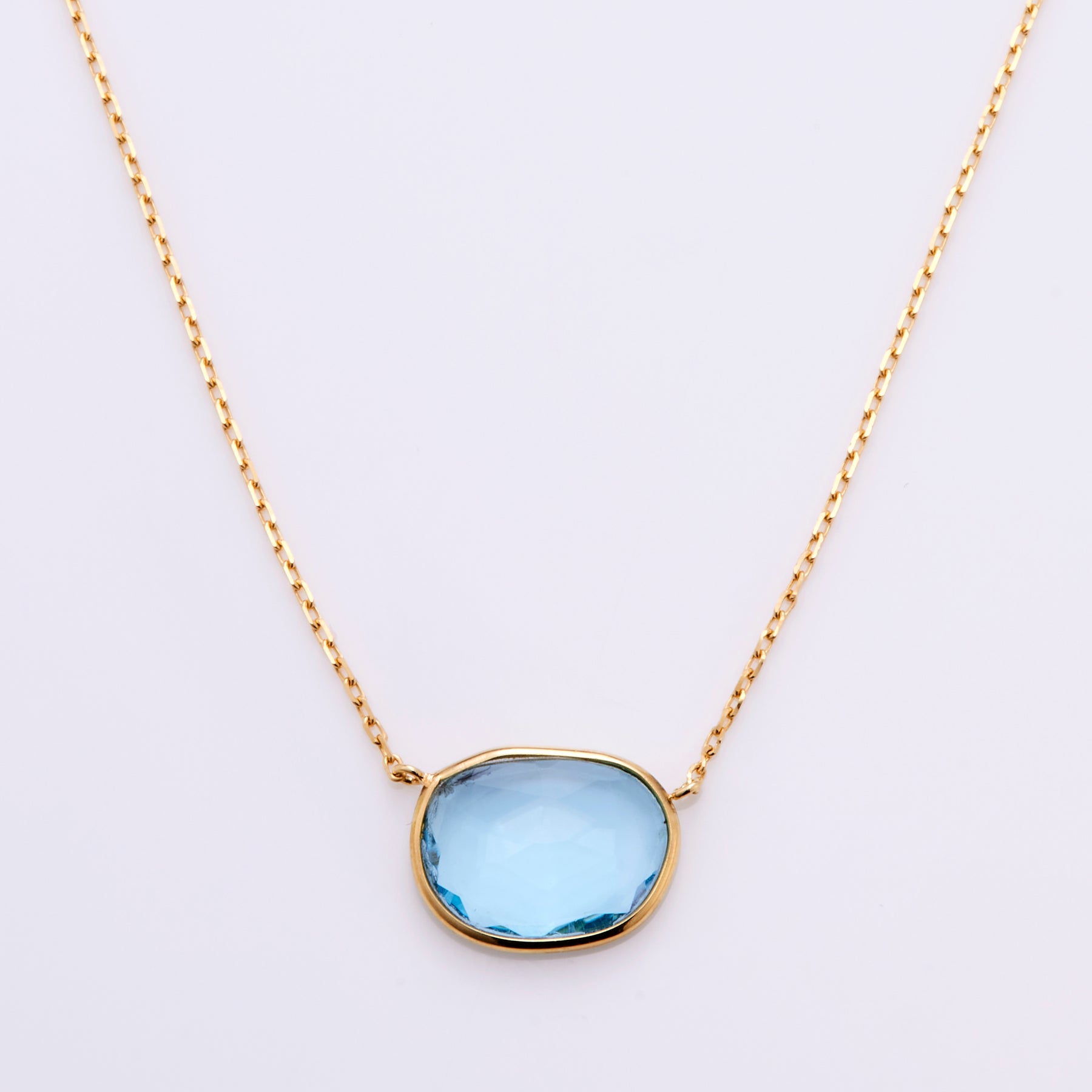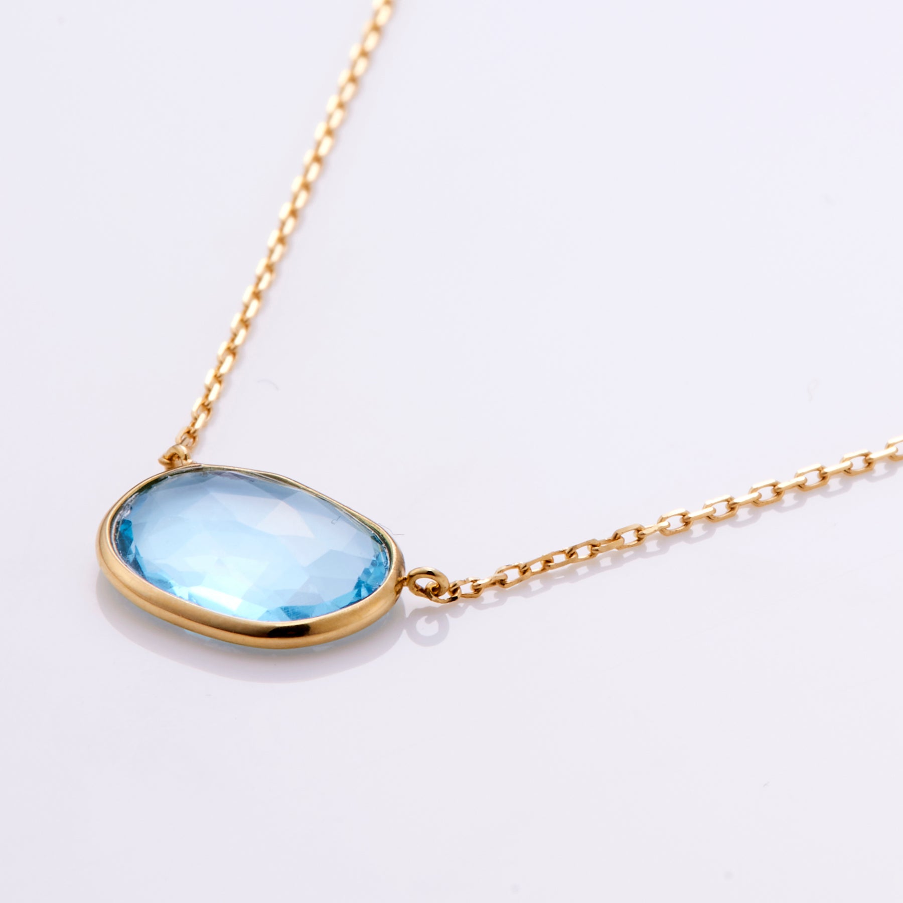 天然石をゴールドで包み込むシンプルなデザインのグロウネックレスは、透明感ある天然石と18金の輝きが、身に付けた人をも輝かせる。鮮やかな青が印象的で上品なブルートパーズには、ローズカットを施しており、石の表面がキラキラと華やかに見せます。コーディネートのワンポイントになるネックレスです。