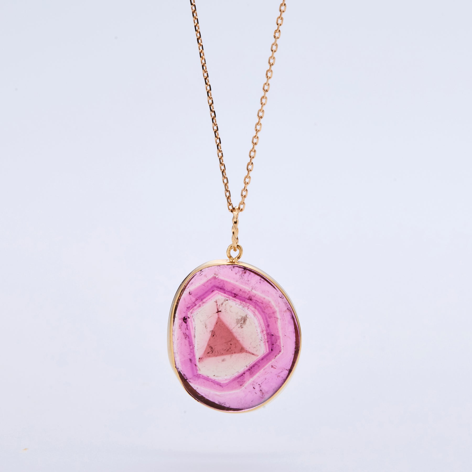 鮮やかなピンクが目を引く、ピンク ウォーターメロン トルマリンのペンダントトップ。その自然が生み出した唯一無二の模様は、まさに世界にひとつだけの個性を宿しています。