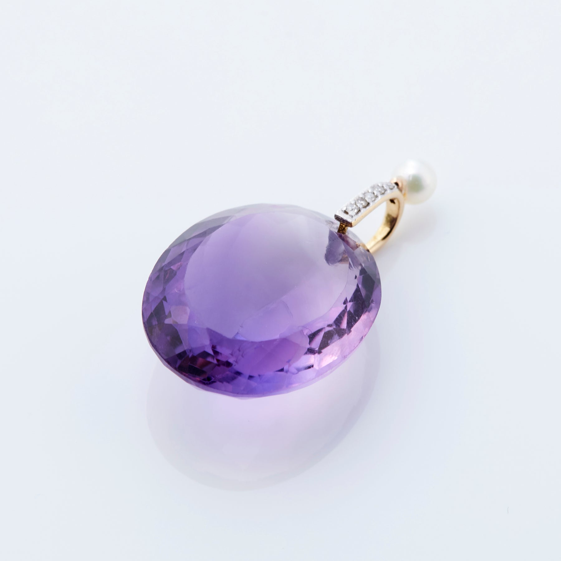 アメジストの深いパープルにアコヤパールのホワイトのコントラストが印象的なペンダントトップ。金具の部分にはメレのダイヤモンドが散りばめられており、個性あふれる18金のペンダントトップです。ショートタイプのネックレスにはもちろん、ロングネックレスに合わせてもコーディネートしていただけます。こちらは一点ものになります。