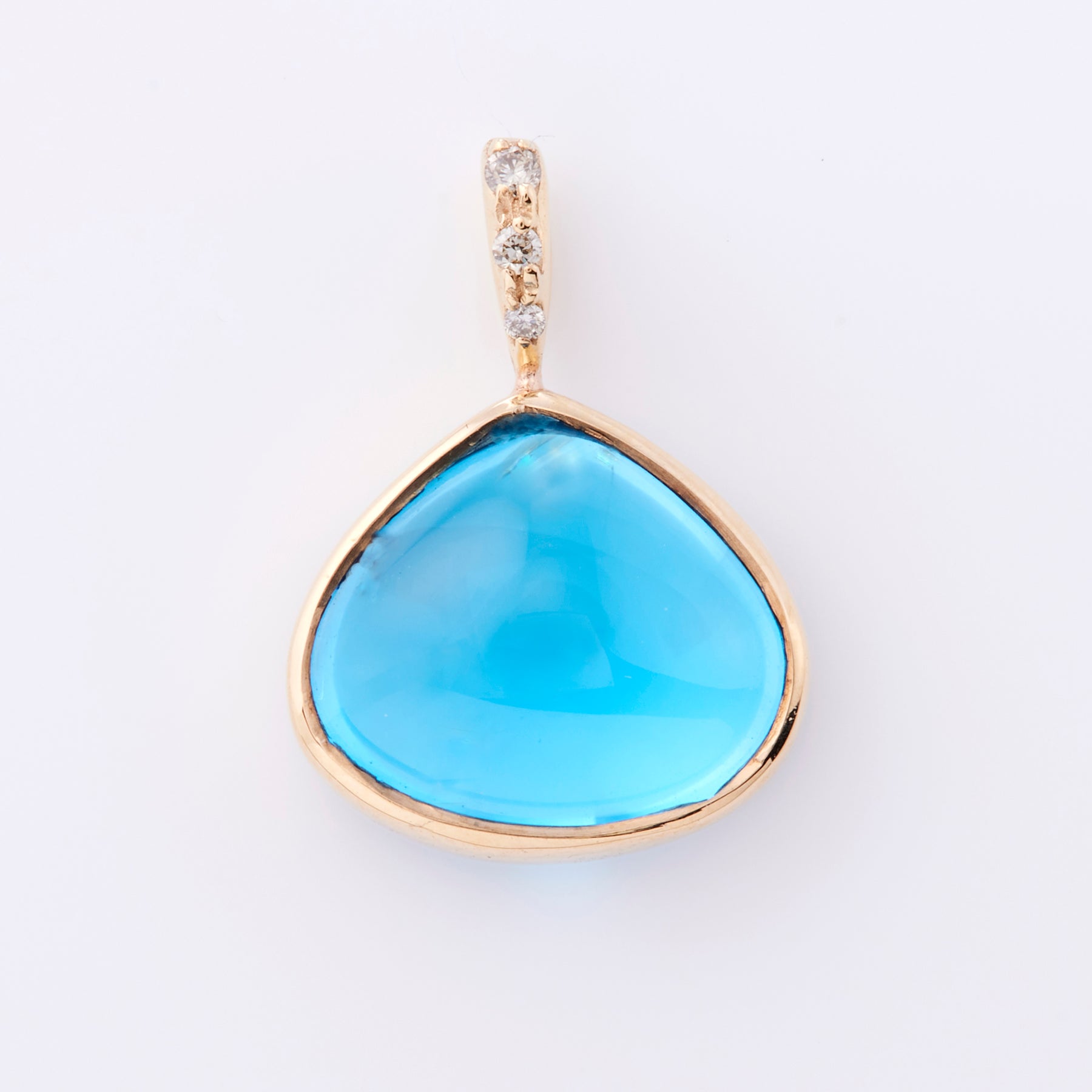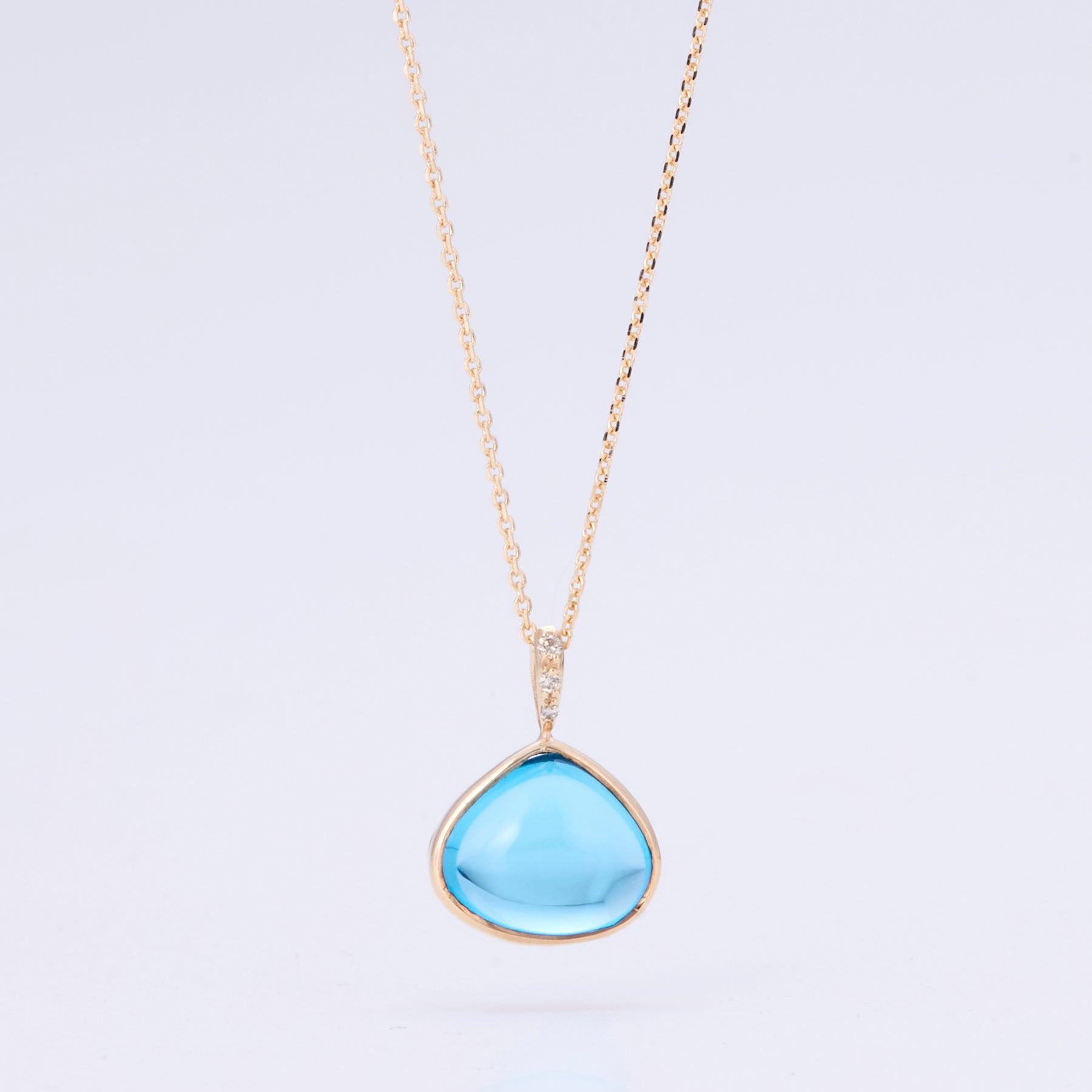 澄んだブルーが魅力的なブルートパーズを、カボションカットで仕上げダイヤを合わせた10金のペンダントトップ。ゴールドの輝きがブルートパーズの透明感を引き立てます。ショートネックレスでもロングネックレスでもどちらでも合わせて頂けます。