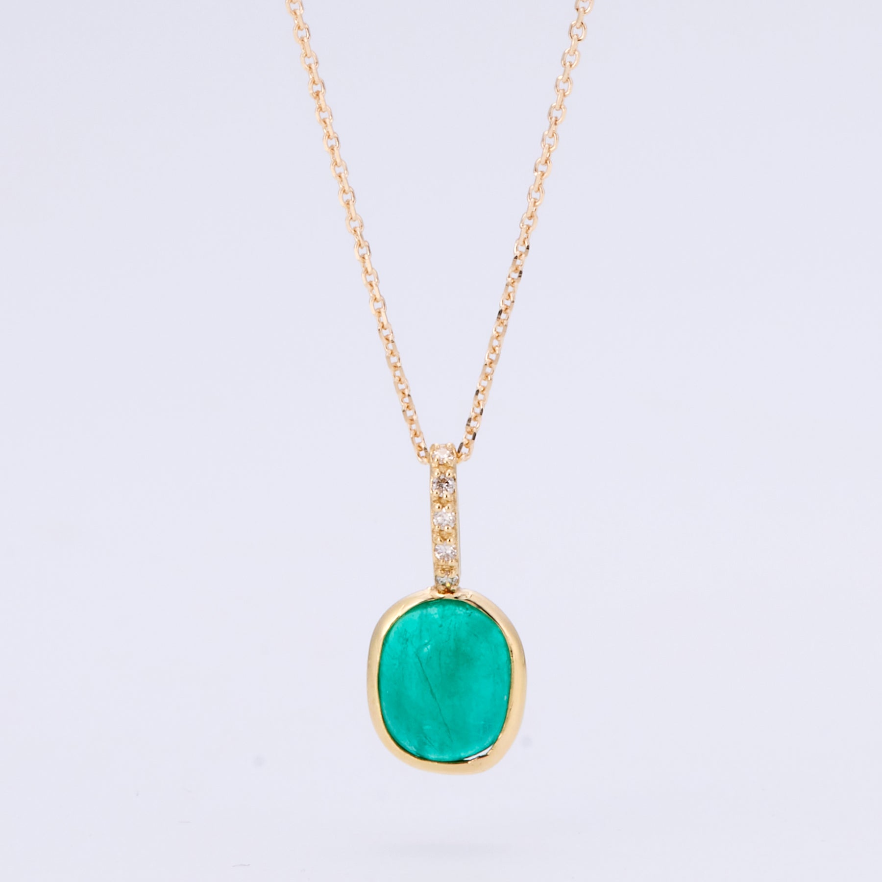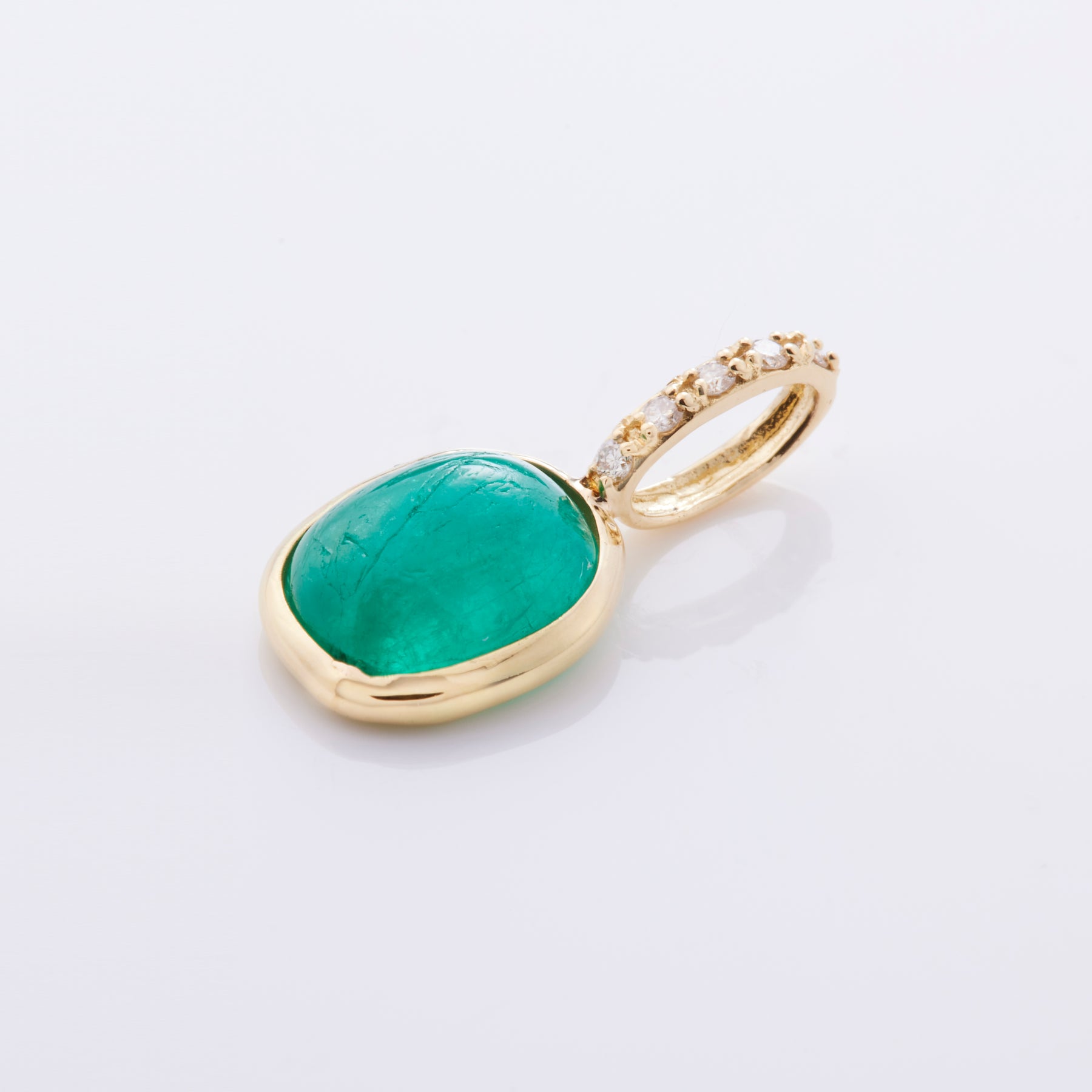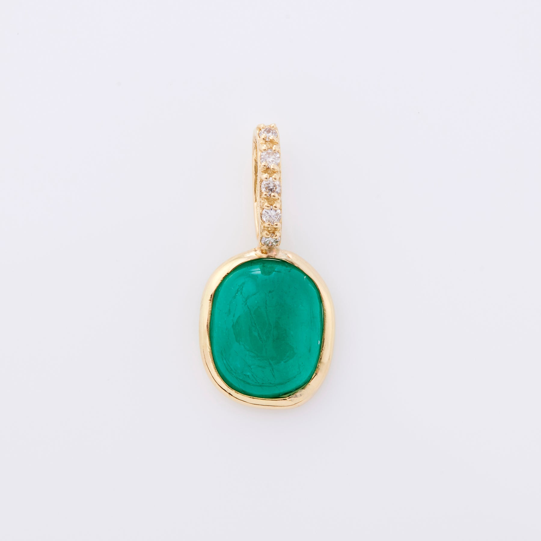 深いグリーンが印象的なエメラルドのペンダントトップ。金具の部分にダイヤモンドがあしらわれており特別感があります。