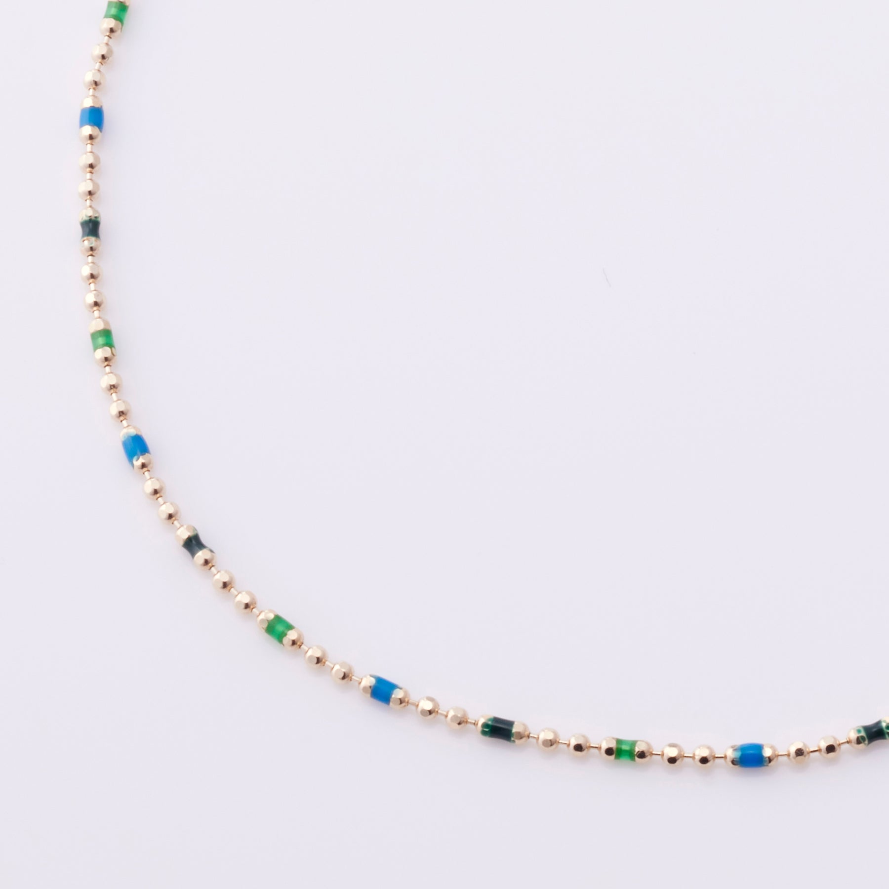 ツブツブとまるでカラーストーンがついているかのようなルミネボールチェーンブレスレット。繊細なデザインのコレットのボールチェーンに特殊樹脂でグリーンからブルーへの色の移り変わりをイメージしています。お色を付けています。また天然石とは違った表情が楽しめるブレスレットです。
