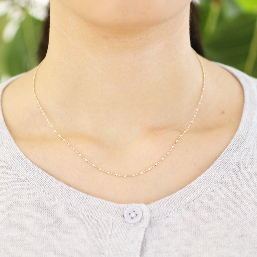 重ね付けはもちろん、1本でシンプルにつけられてお顔回りを明るくみせてくれそうです。ペンダントトップを通してもお使い頂けます。