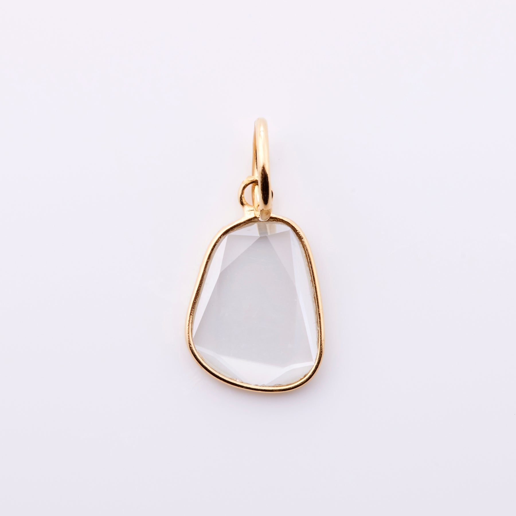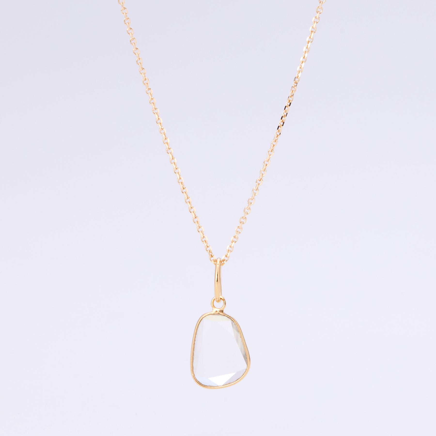 ダイヤモンドと同じくらいの硬度と輝きを持つモアッサナイトのペンダントトップ。表面にはカットを施しており、フチのカット面は虹のように輝きます。透明感のあるペンダントトップなので、お洋服を選ばずに合わせていただけます。