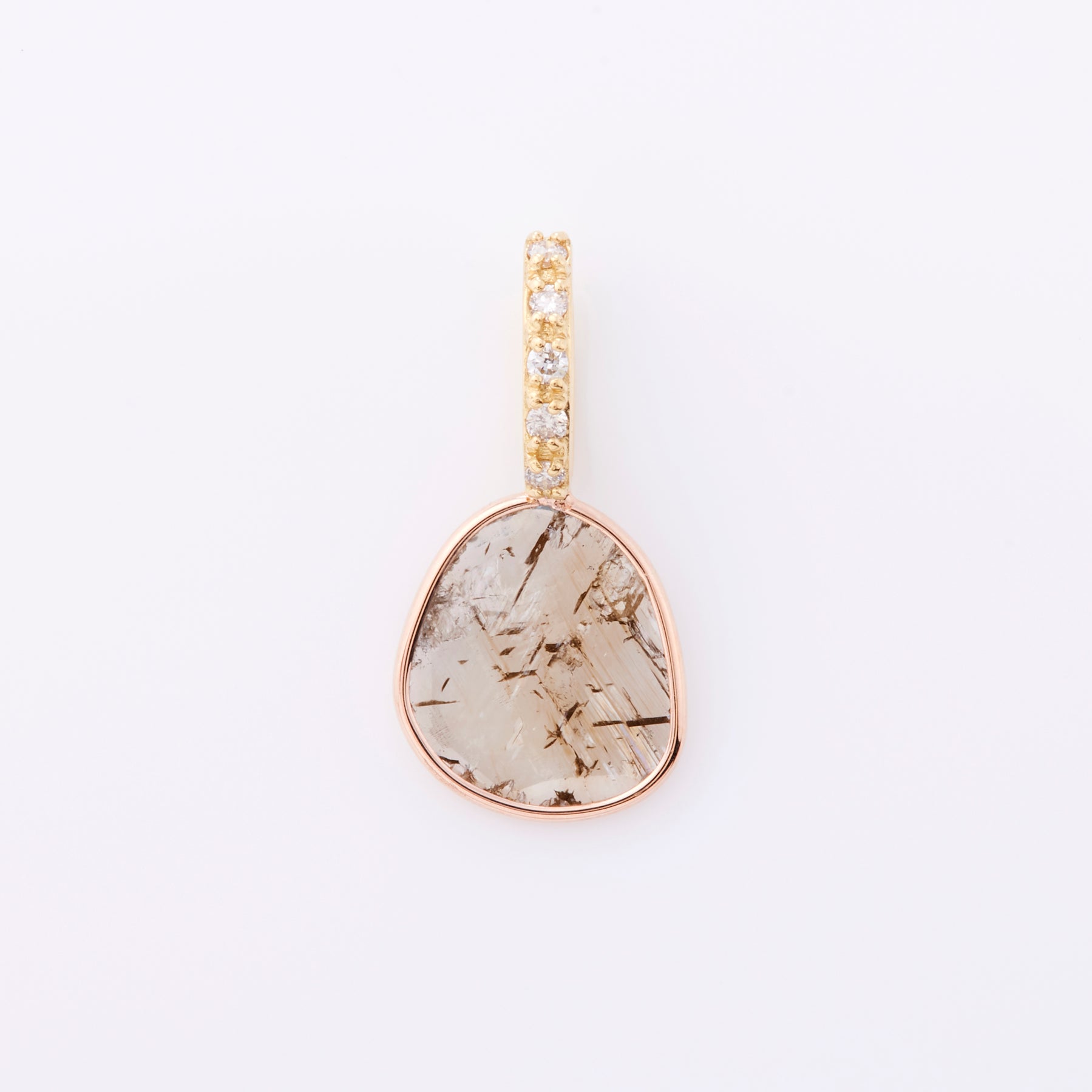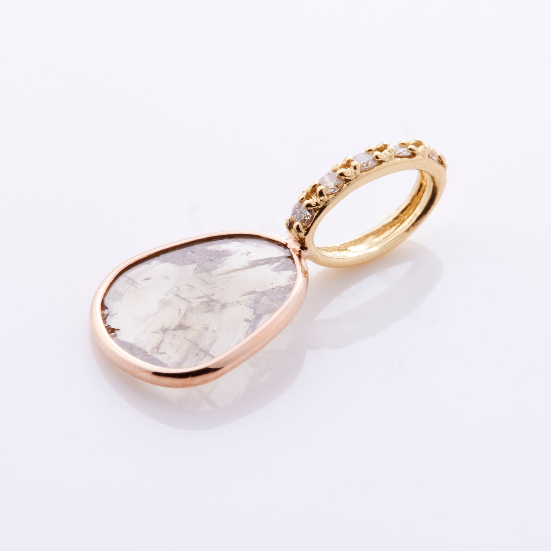 ダイヤの原石をスライス状に薄く断面カットしたを施したダイヤ。オーガニックダイヤにメレダイヤを合わせたとっておきです。石、そのものの模様が魅力的で、ダイヤの表面はまるでミラーのように輝きを放ちます。ダイヤの異なる輝きを楽しむことのできるペンダントトップ。こちらは一点ものになります。