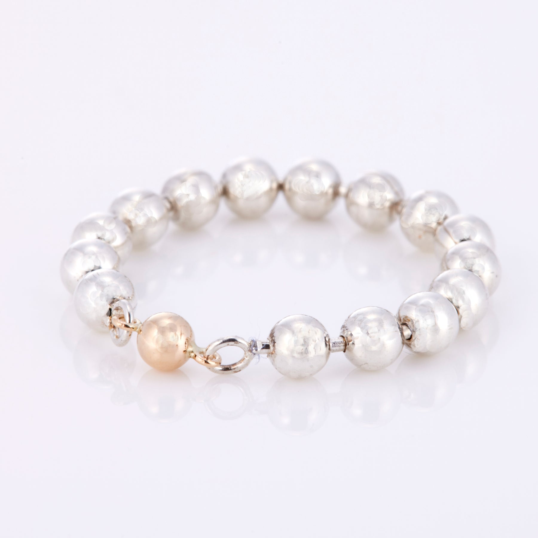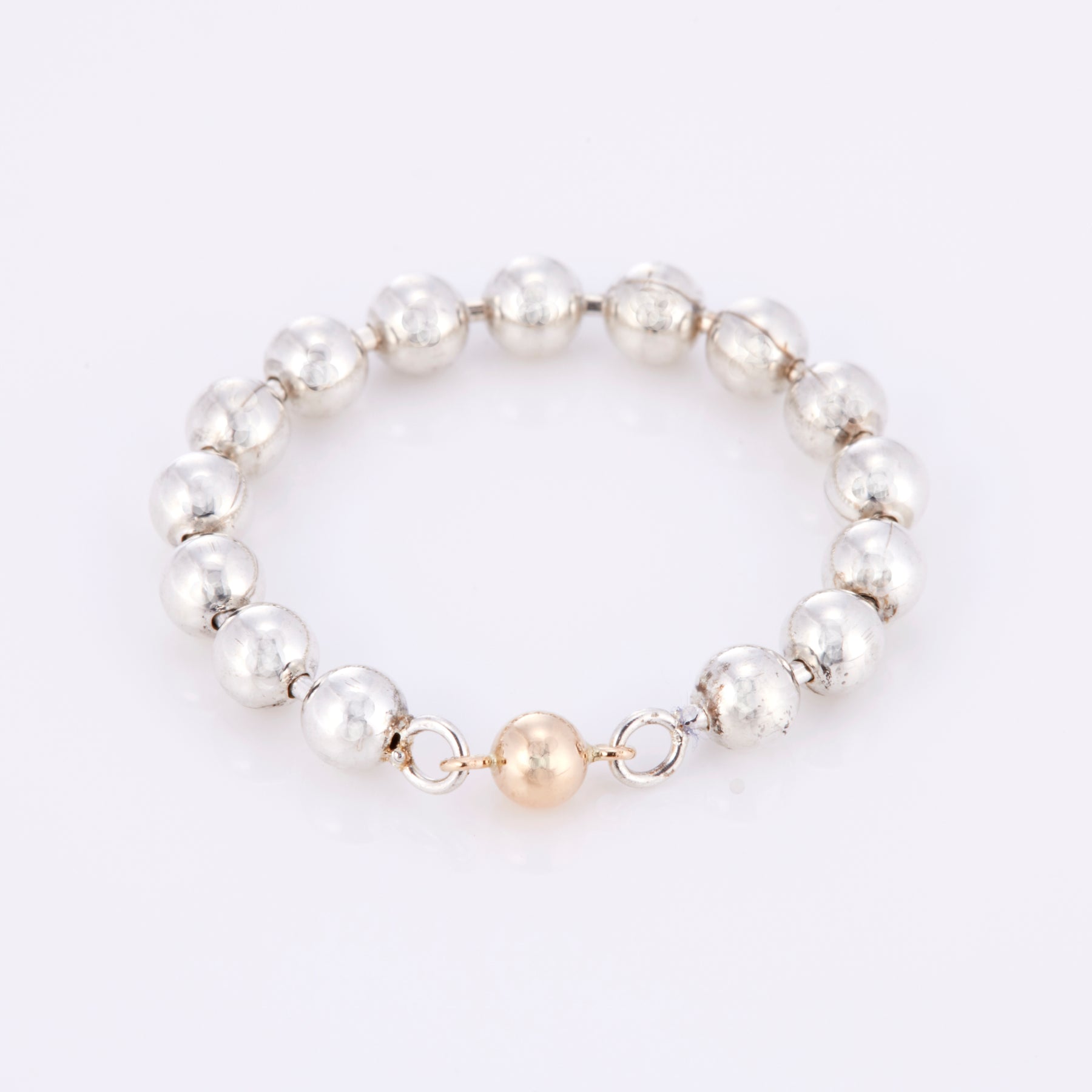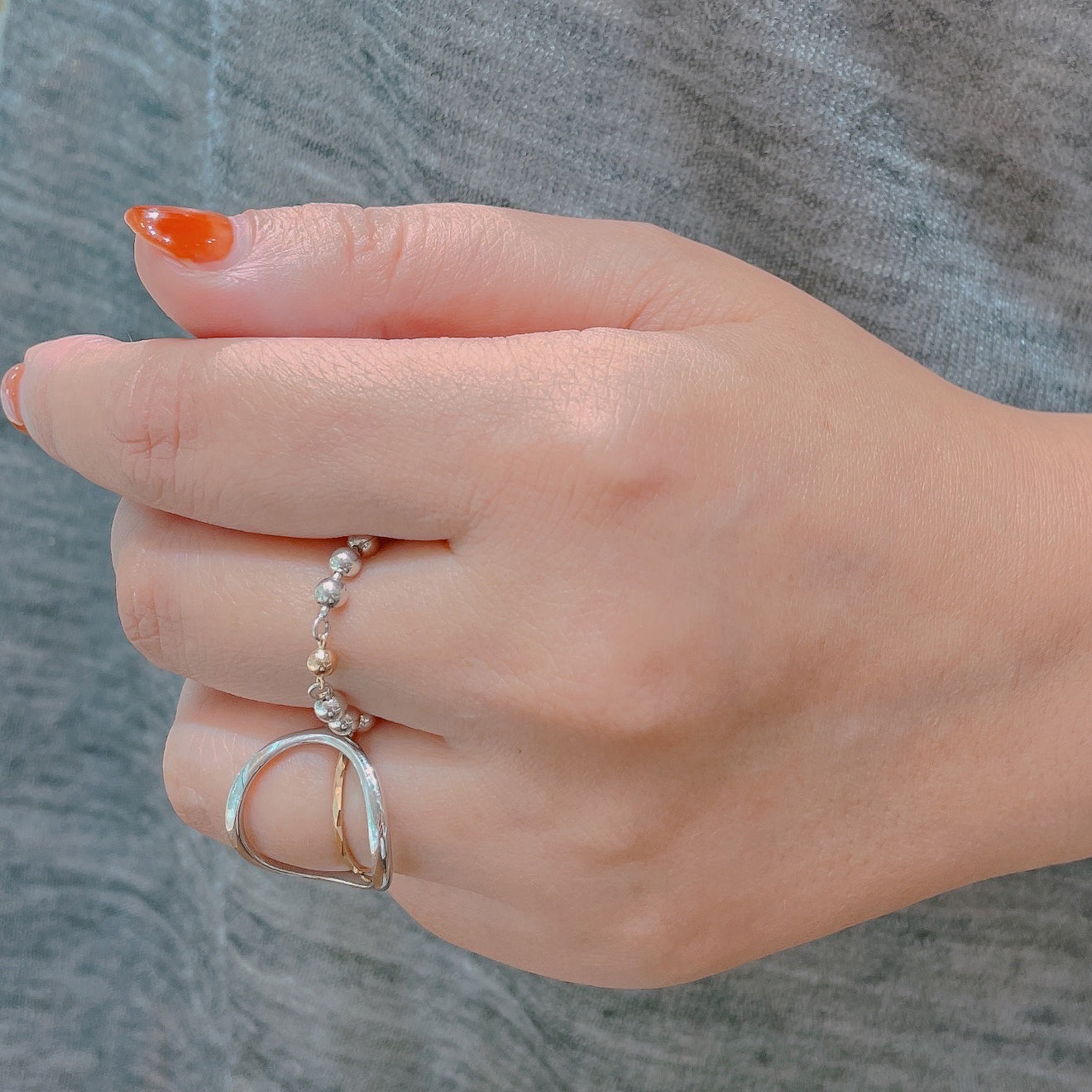 シルバーとゴールドのコンビカラーのボールチェーンリング。ボリューム感があるので、1本ではもちろん、リングの重ね付けコーディネートにも活躍しそうです。