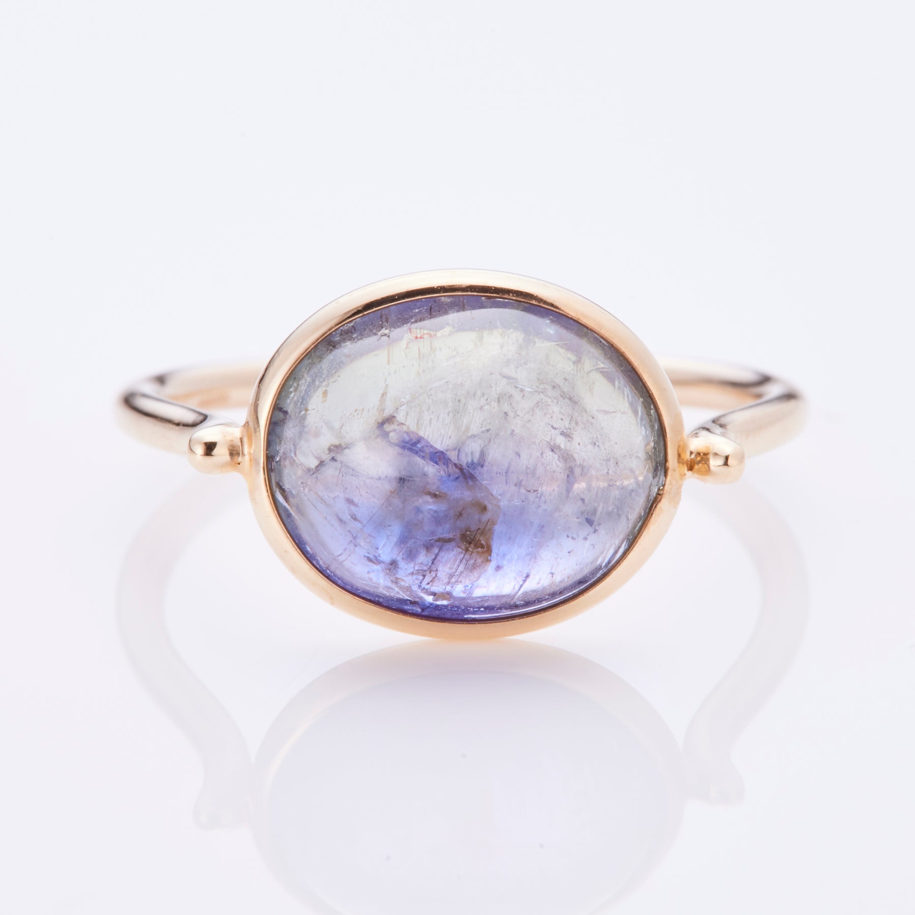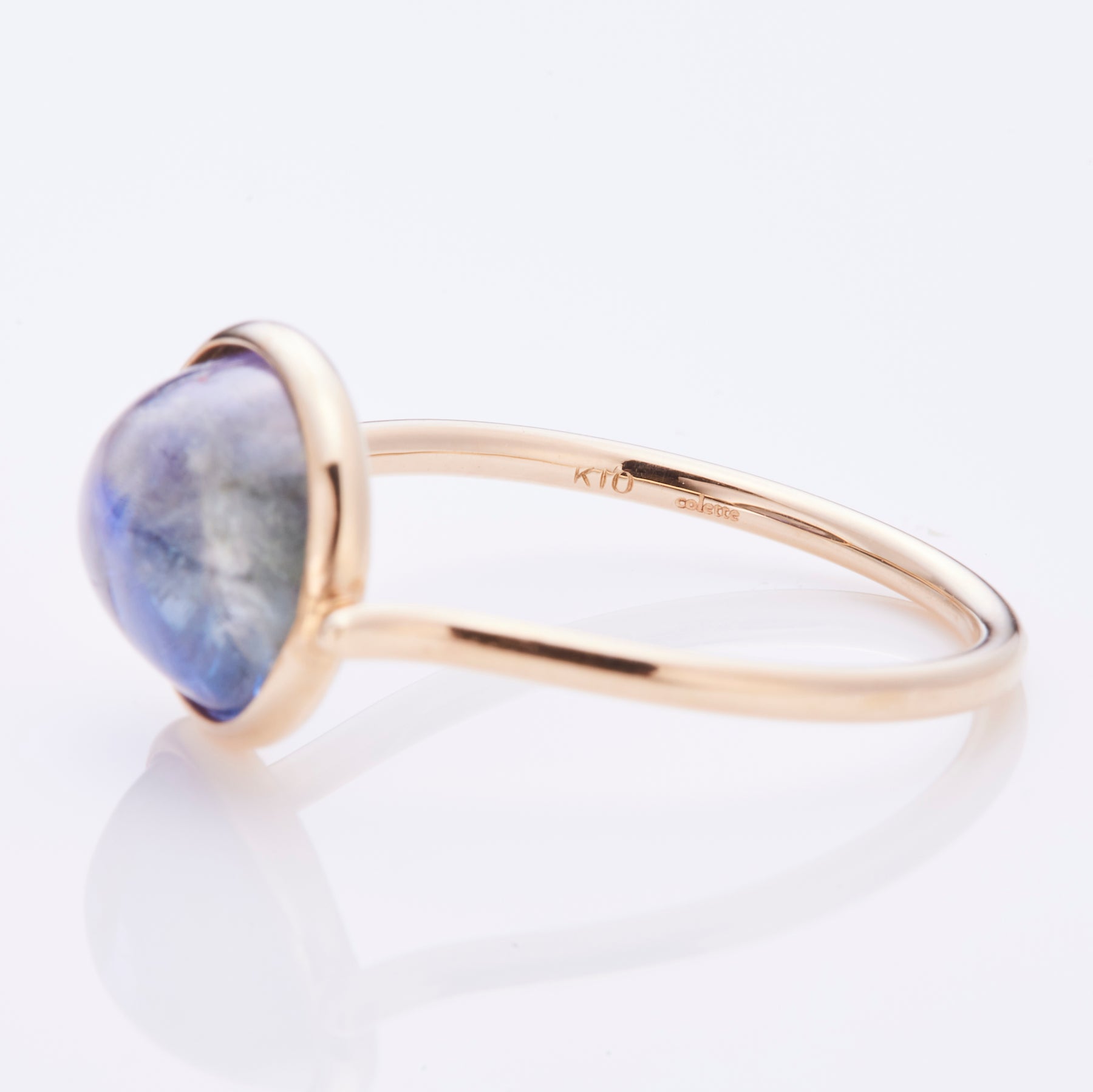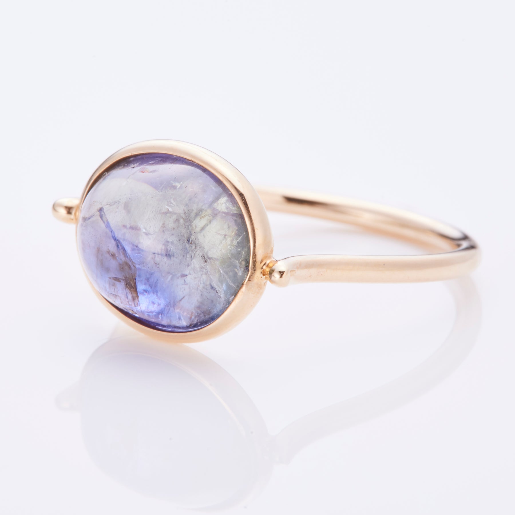 静寂の空と夕暮れが溶け合うような、神秘的なグラデーションが美しい、バイカラータンザナイトのリング。ブルー、パープルにグリーンが入り混じった色合いで、柔らかな輝きを放つゴールドの包み込んだデザインが優しく引き立てます。