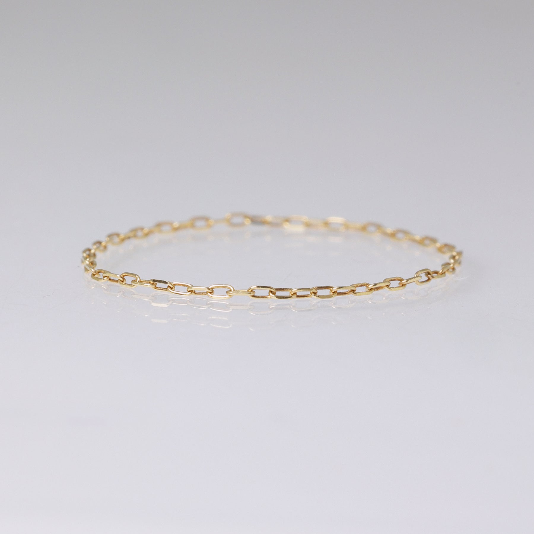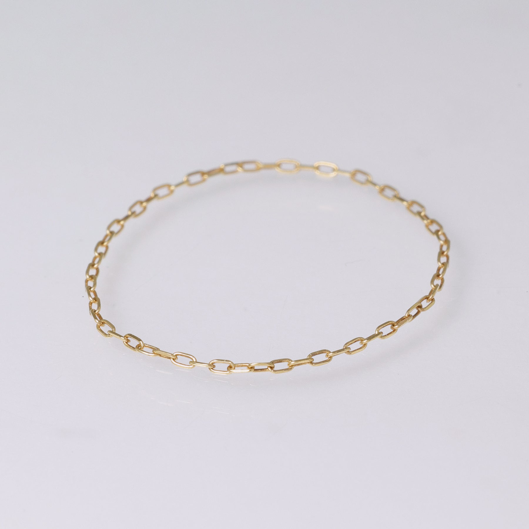 シンプルなデザインの18金のチェーンリング。光の反射を受けてカットの施された繊細なチェーンが輝きます。チェーンタイプのリングなので、通常より2号大き目サイズをおすすめいたします。※デザインが繊細なので、お取り扱いには十分にご注意下さい。※この商品に関しましてはサイズ直し不可となります。
