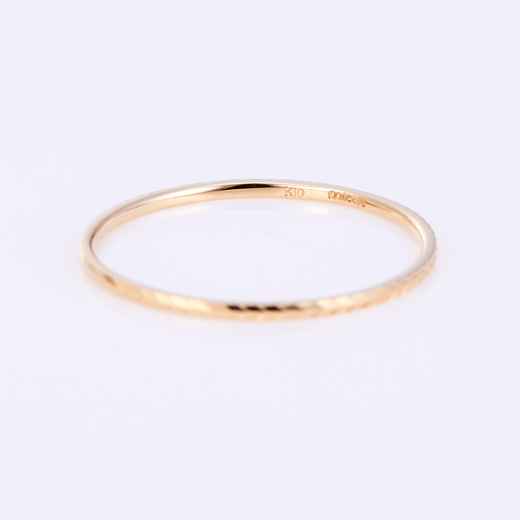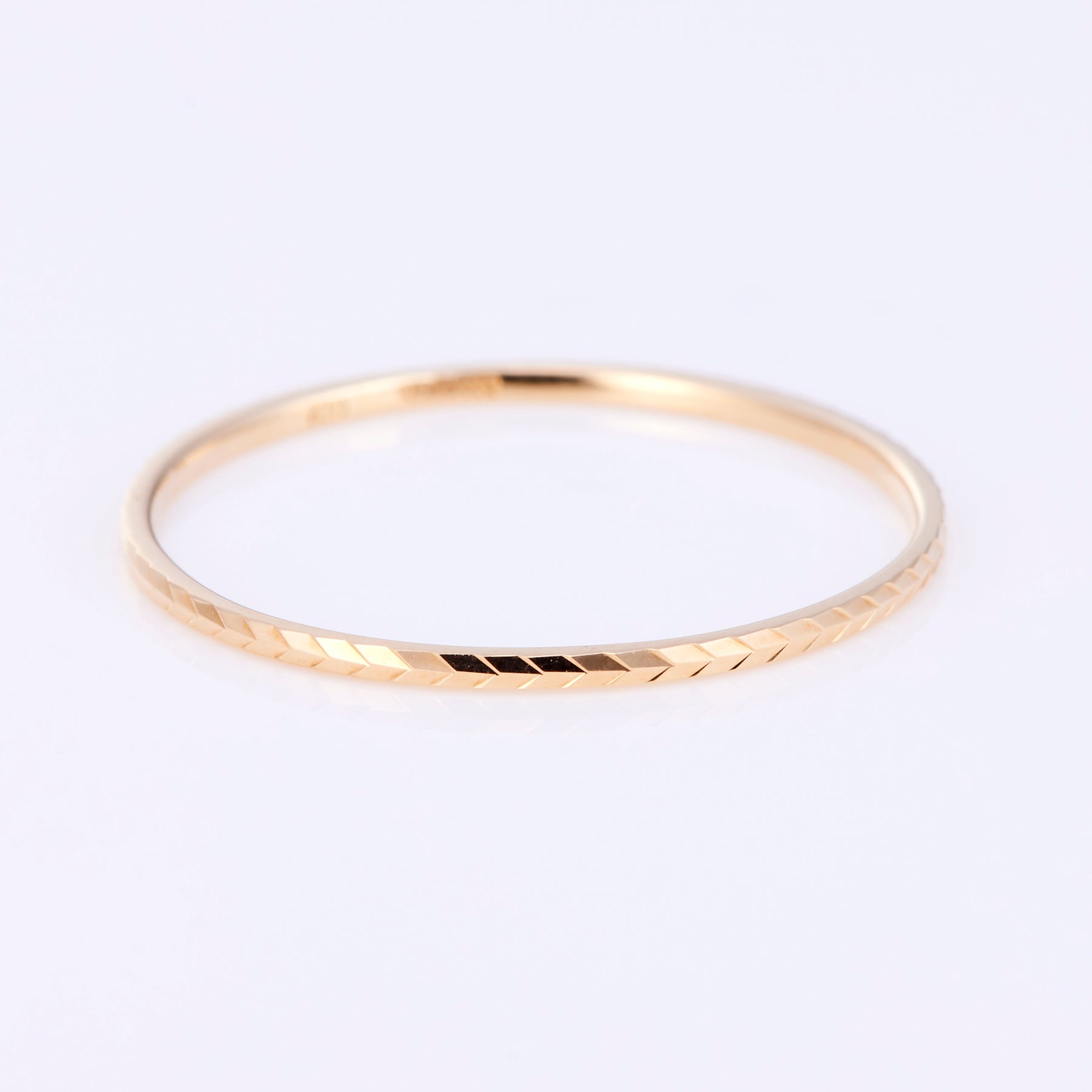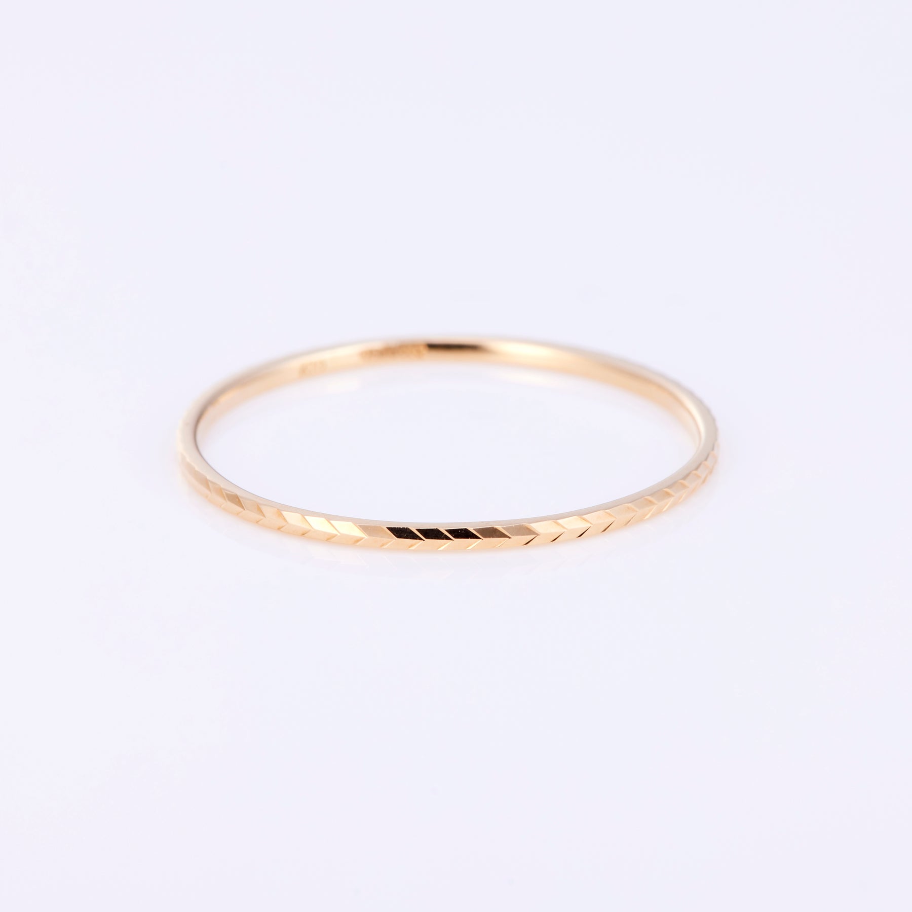 シンプルで華奢なデザインのイエローゴールドのピンキーリング。アローの模様が刻まれています。表面に細やかなカットが施されているので、角度が変わるたびキラキラと輝きます。お好きな模様のリングで重ね付けされても素敵です。1本ではもちろん、リングの重ね付けにも活躍しそうです。