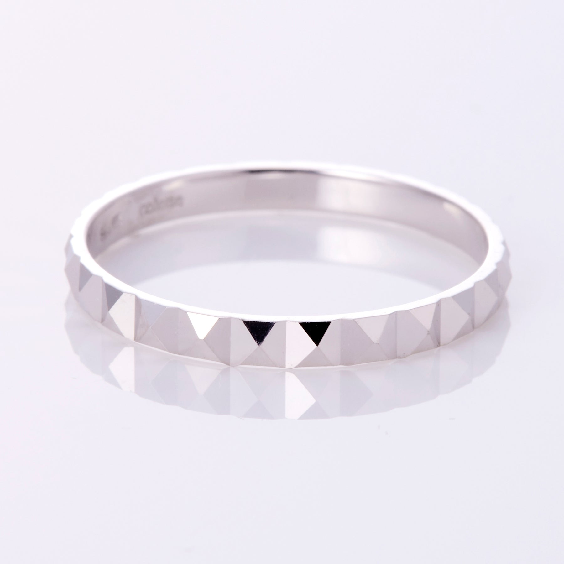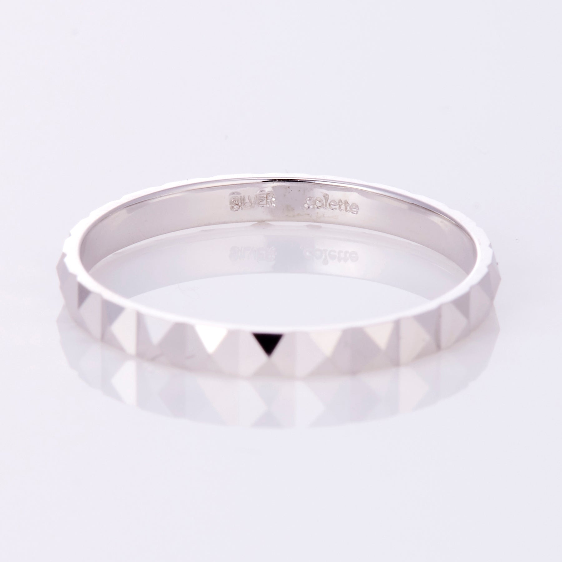 シンプルで華奢なデザインのシルバーのリング。リングの表面にはカットが施されているので、角度が変わるたびキラキラと輝きます。お好きな模様のリングで重ね付けされても素敵です。1本でももちろん、シルバーのリングや、ゴールドのリングとの重ね付けにも活躍しそうです。リングの全周にデザインがあるので、くるくる回っても気にならないデザインです。