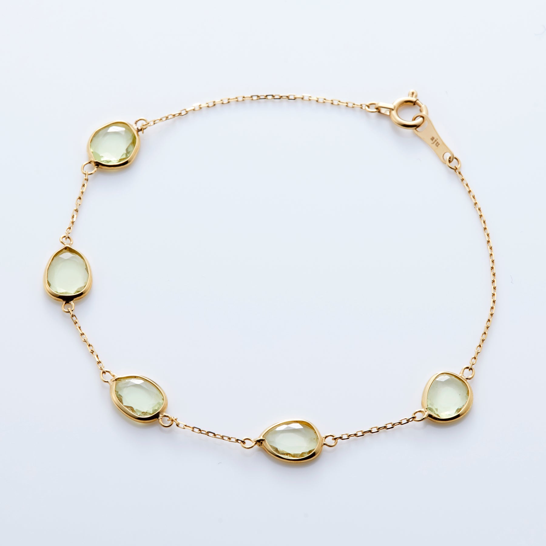 The vibrant lemon yellow color of the crystal beryl is cut on both the front and back of the stone, giving it a translucent appearance that makes it appear to blend in with your skin. This delicate and beautiful crystal beryl makes a special bracelet.