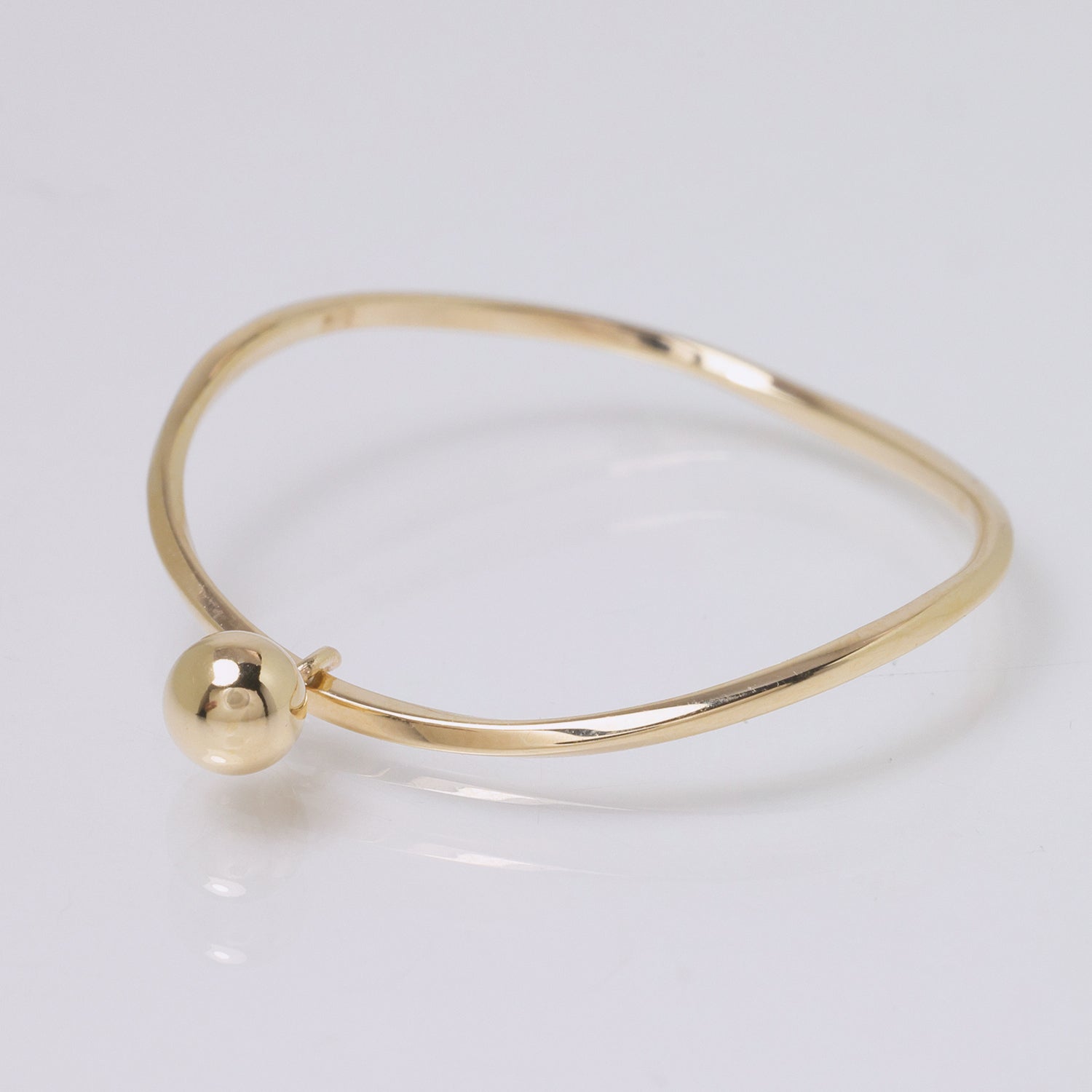 This yellow gold ring has a simple and delicate design. It features a gently curved ring with a gold ball hanging from it.