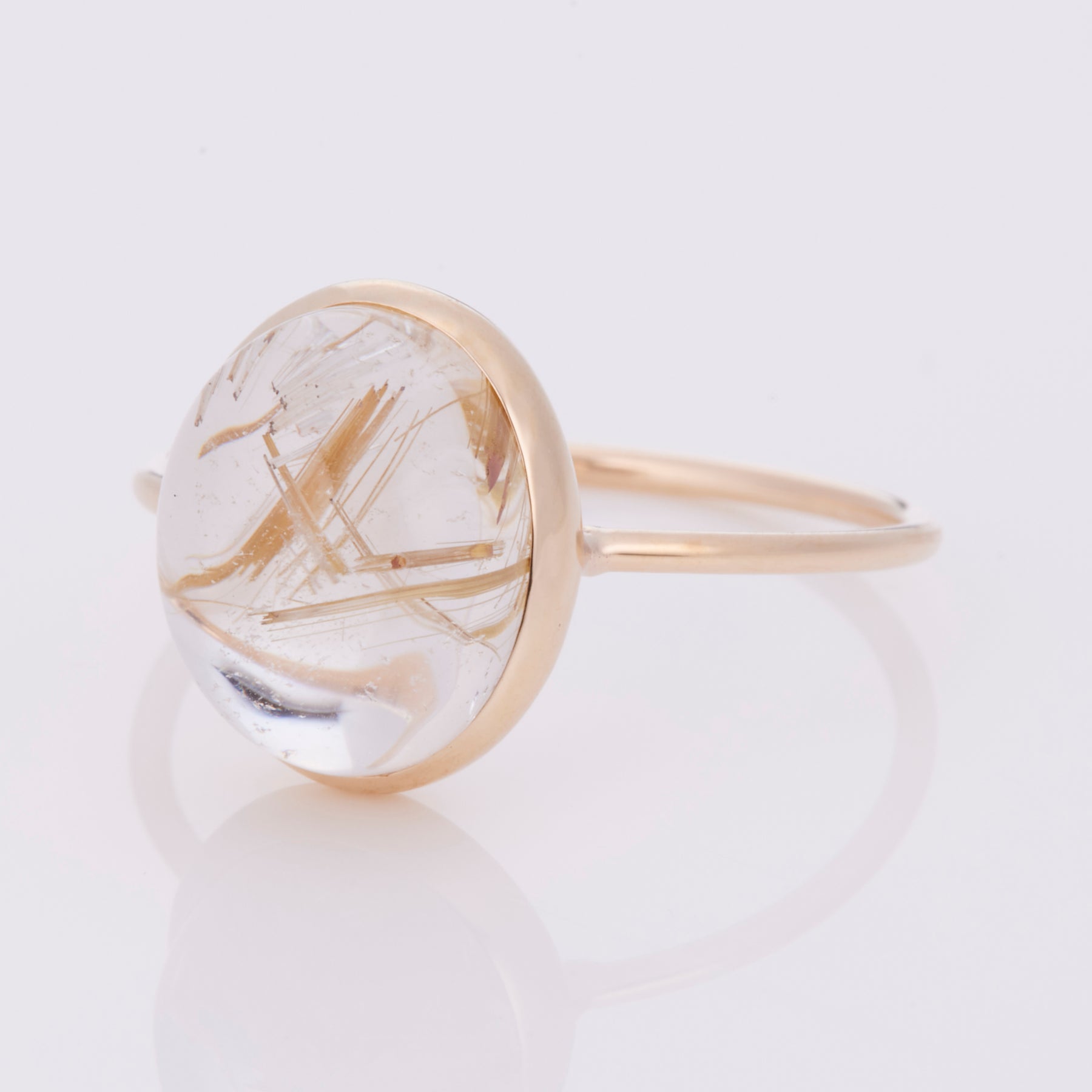 This Charlotte ring features a smooth cabochon-cut rutilated quartz. Rutilated quartz is also known as needle quartz. Its translucent color blends well with the skin. While the stone is voluminous, the ring arms are intentionally delicate, creating a feminine design.