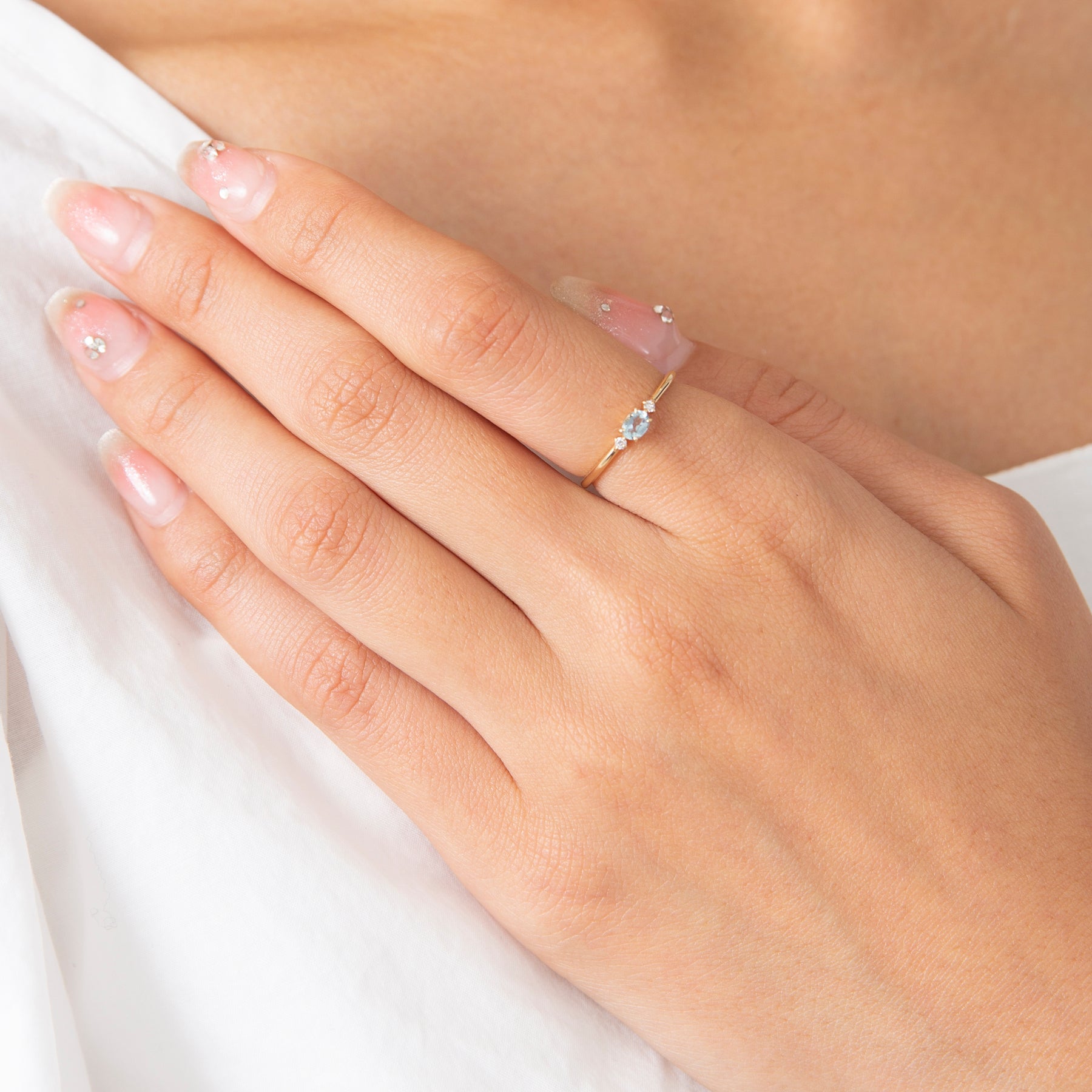 This birthstone ring features lab-grown diamonds set on both sides of the aquamarine. The oval-shaped stone is adorable, and the refreshing light blue and diamonds add a touch of glamour. Aquamarine, the birthstone for March, represents happiness, wealth, and bravery. It also makes a great gift for someone special.