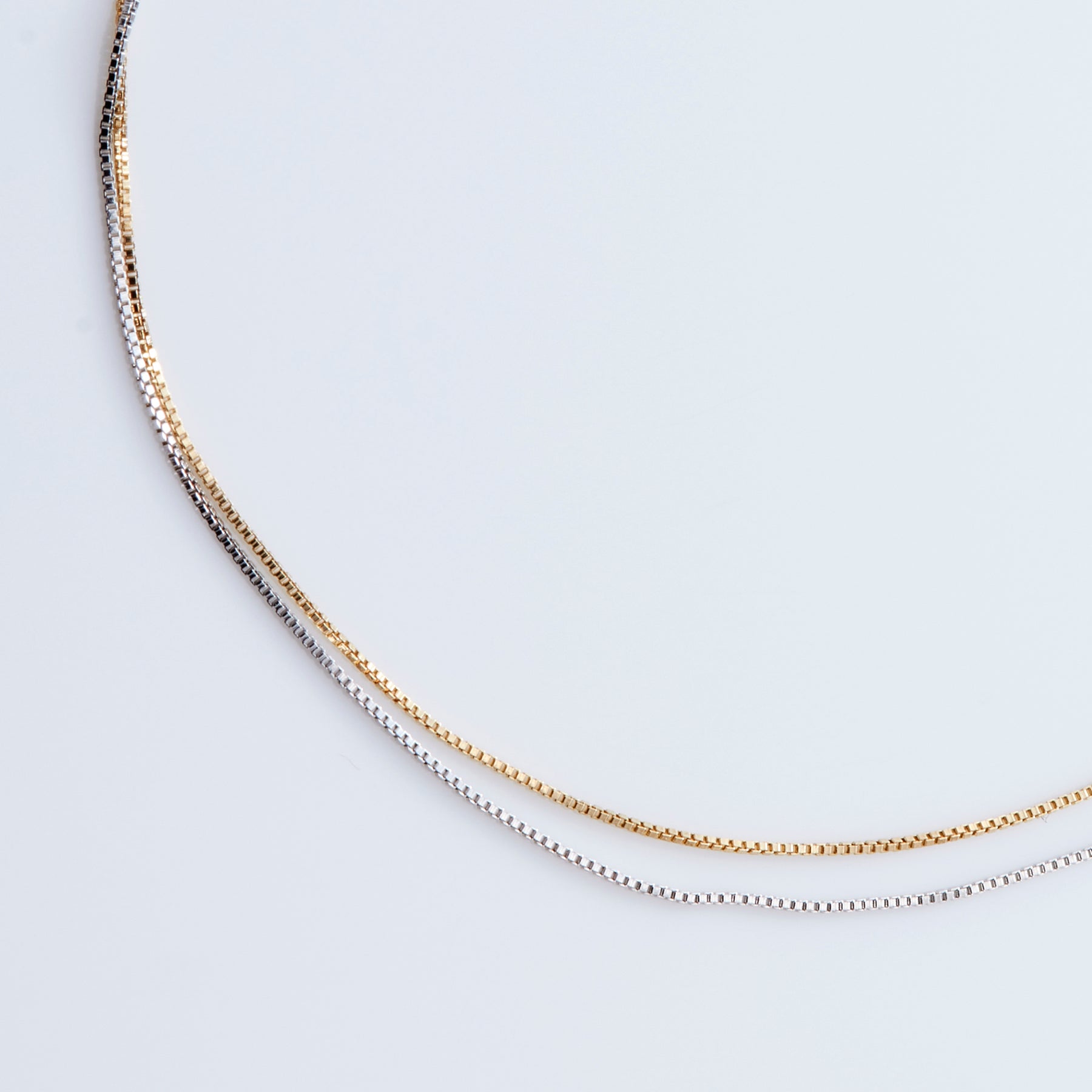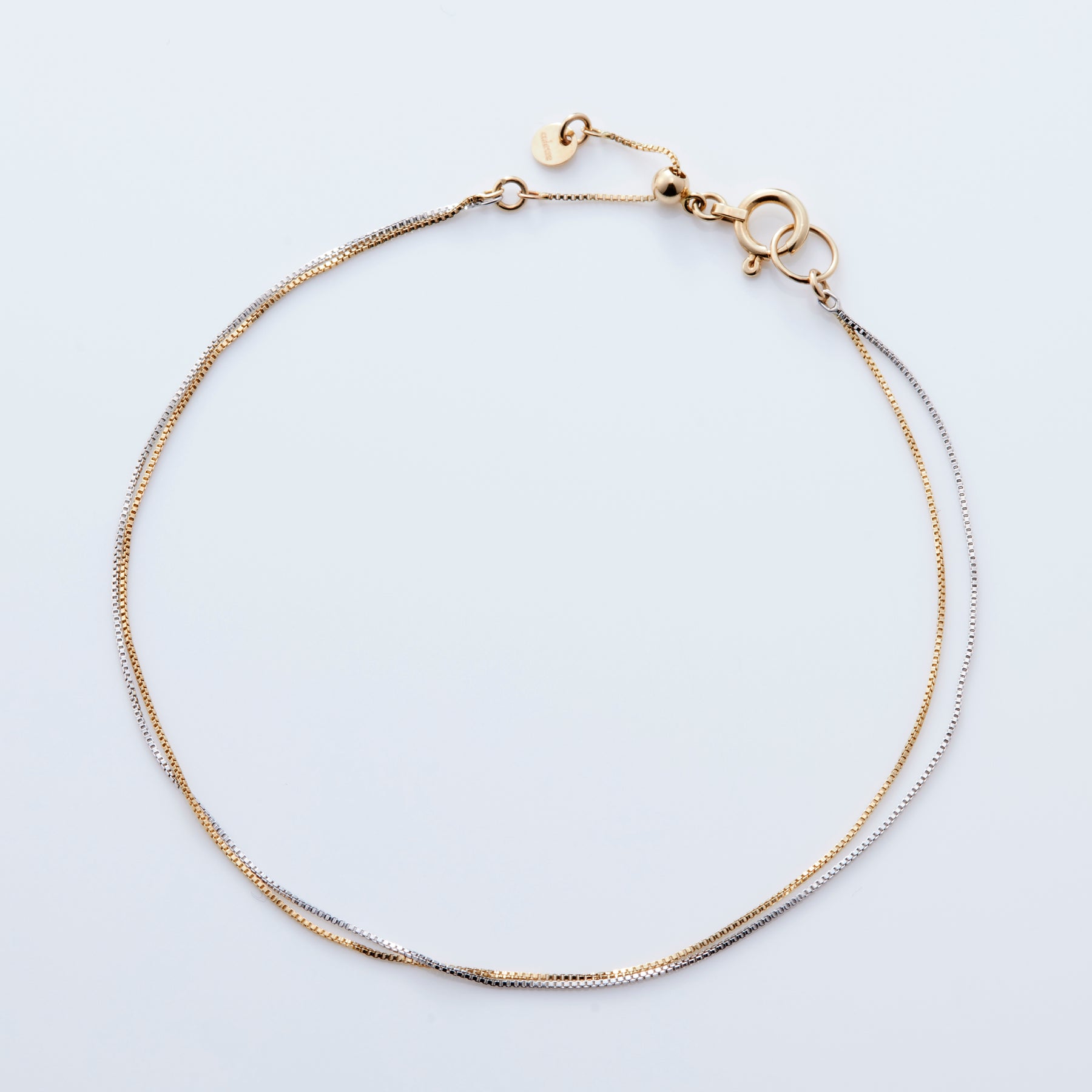 シンプルなベネチアンチェーンを使用したホワイトゴールドとイエローゴールドのコンビカラーの2連ブレスレット。滑らかで艶のあるチェーンが大人の女性を引き立たせてくれます。スライドボール付きなので長さを自由に調節できます。すっきりとしたシンプルなブレスレットは、コーディネートをさりげなく彩ってくれます。