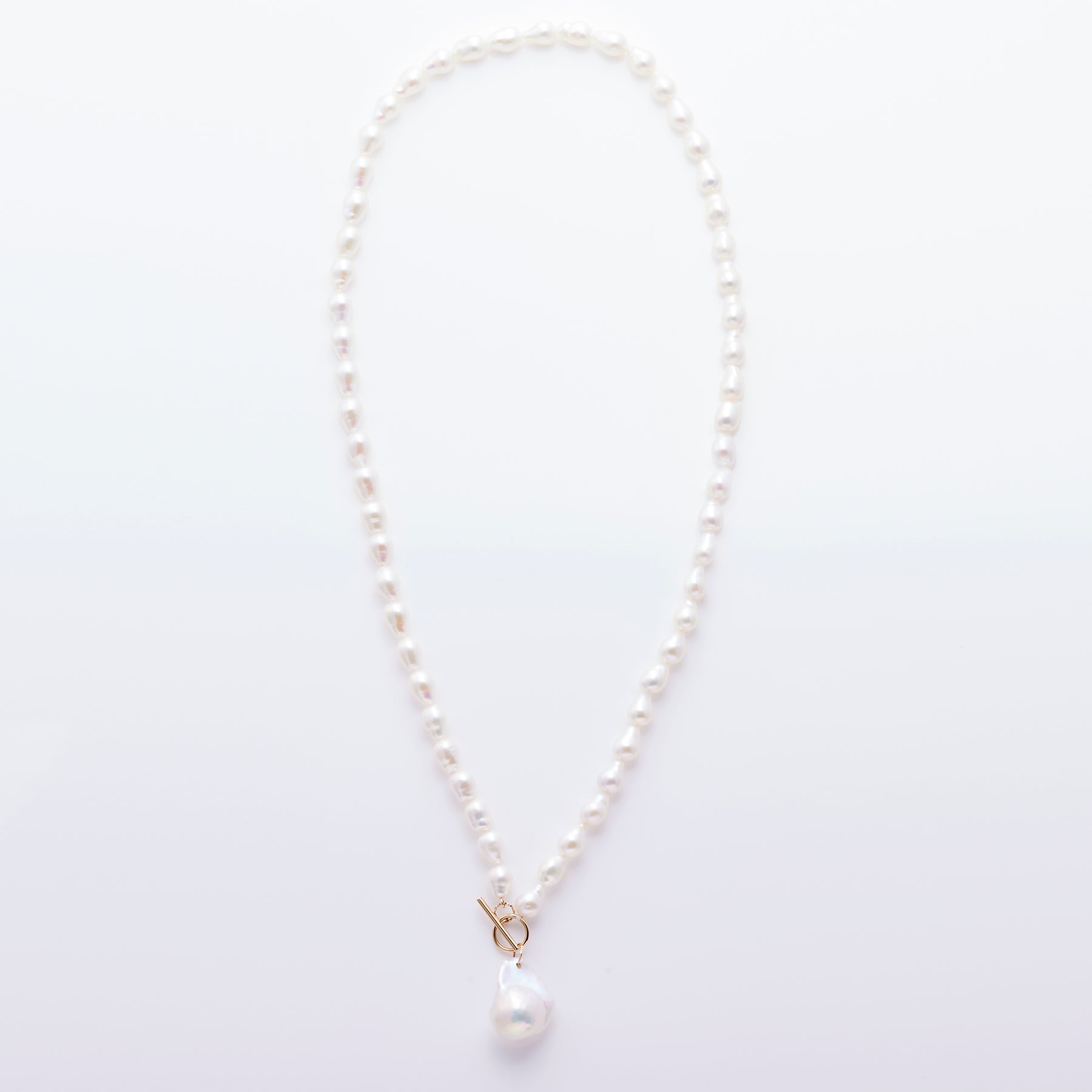 華やかな存在感を放つ、パールのネックレス。ボリューム感がありながらも上品で、どんなスタイルにもエレガントさをプラスしてくれます。金具を正面にしてつけてもいいですし、後ろやサイズにもってきても素敵です。お洋服に合わせて付け方をアレンジできるネックレスです。