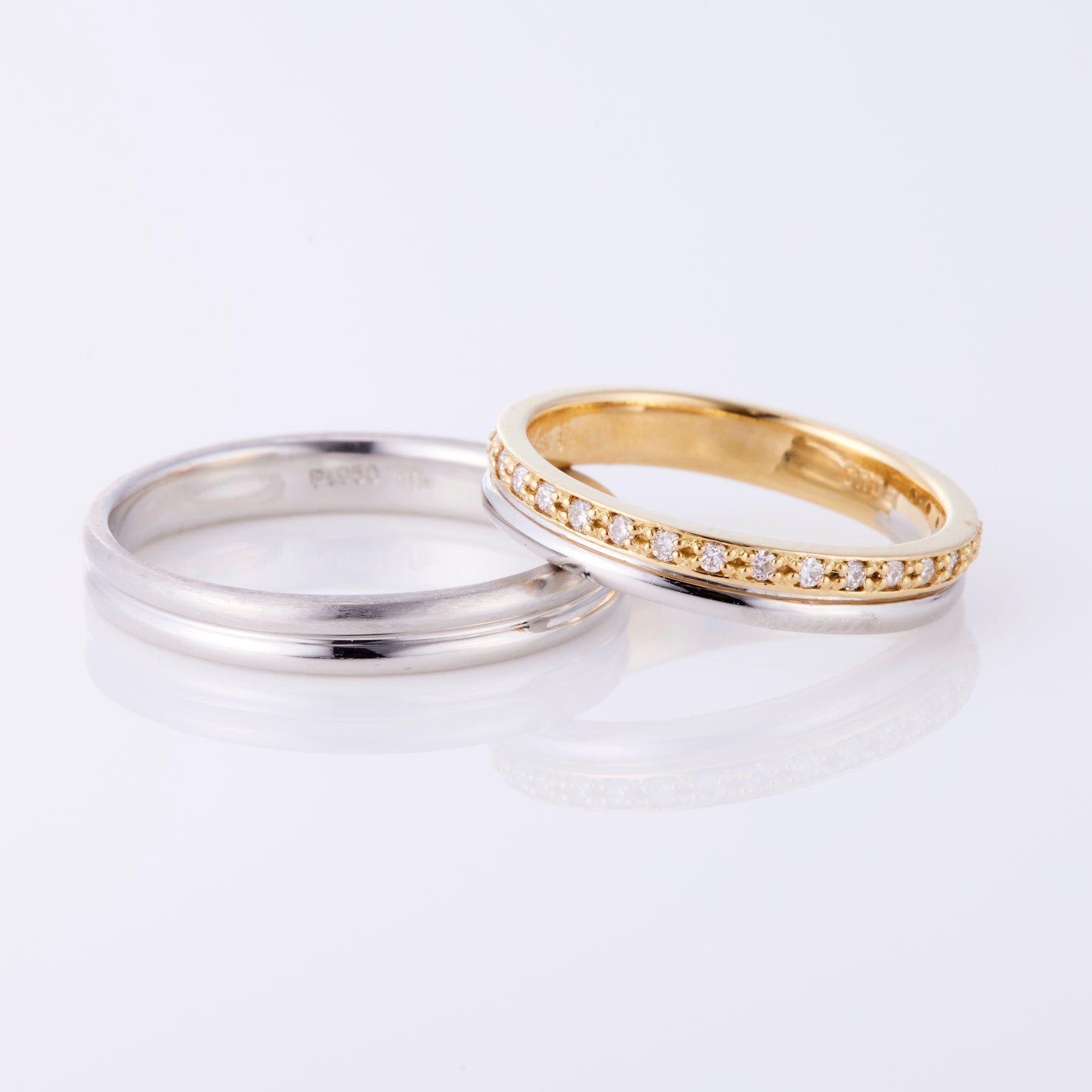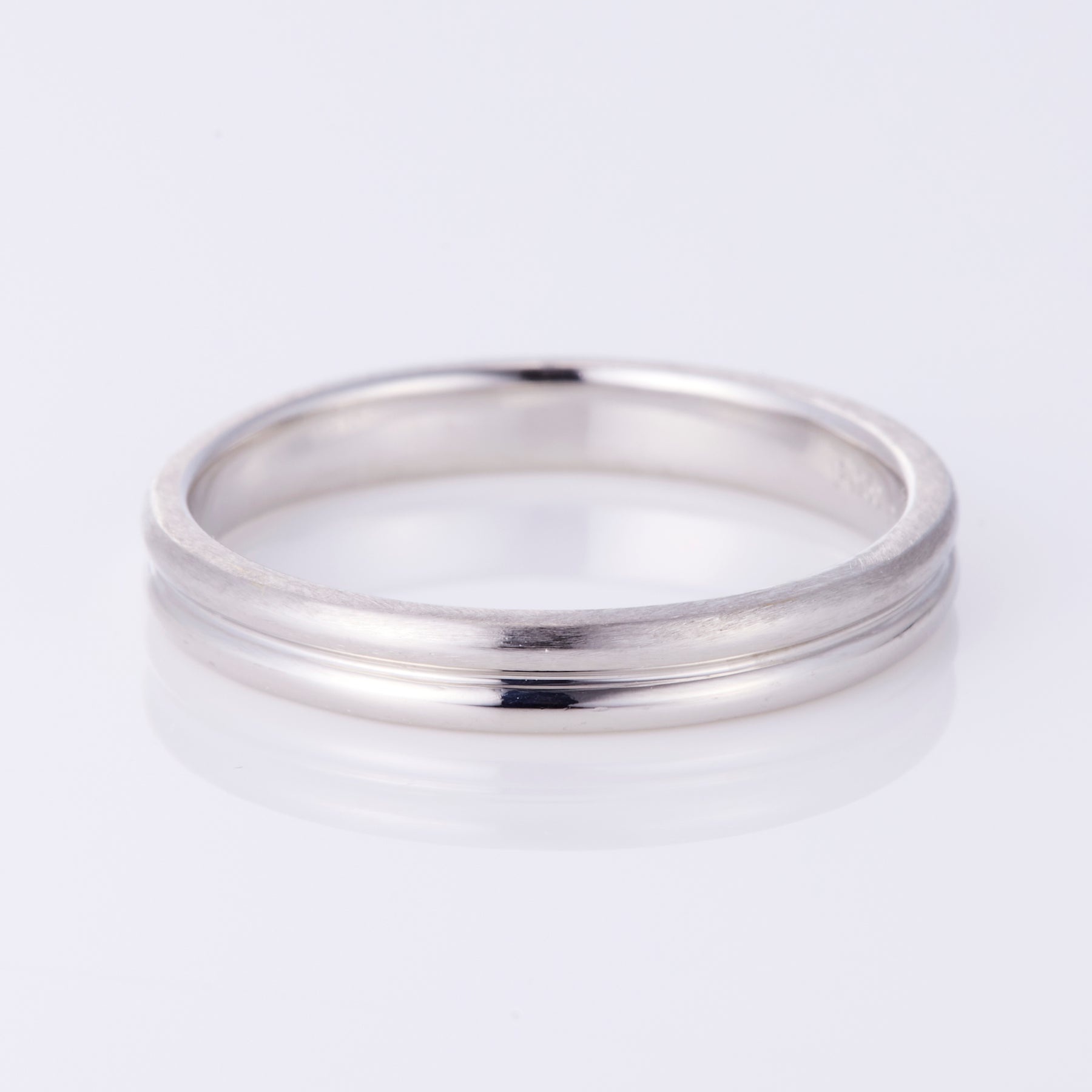 寄り添うお二人の愛を形にしたマリッジリング。2種類の質感の違いはお二人が離れることなく寄り添った姿のようです。シンプルで上質なプラチナと安心感のあるデザインはお手元にしっくりと馴染み末永くお使いいただけます。プラチナのリング2本を重ねたようなリングを重ねたようなデザインは、鏡面とヘアラインが組み合わさっています。