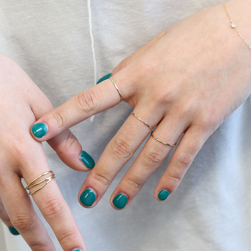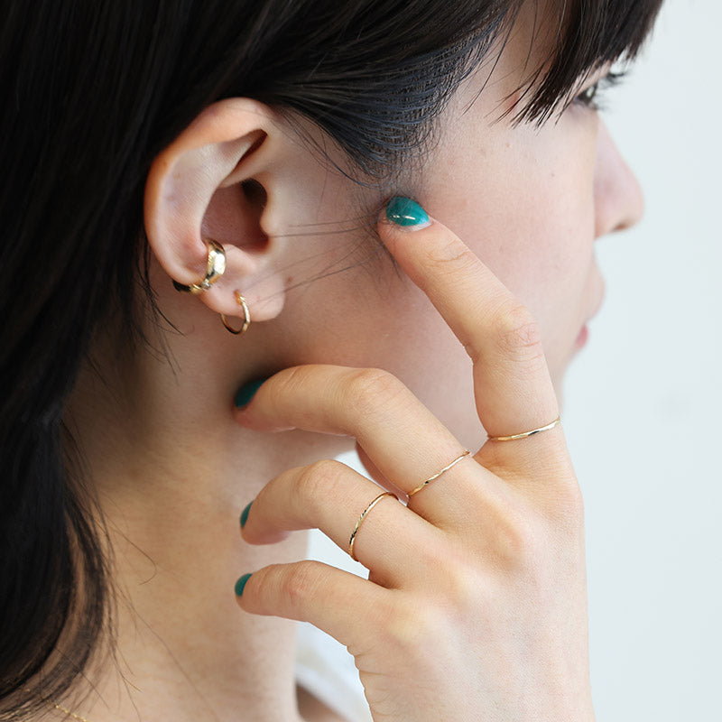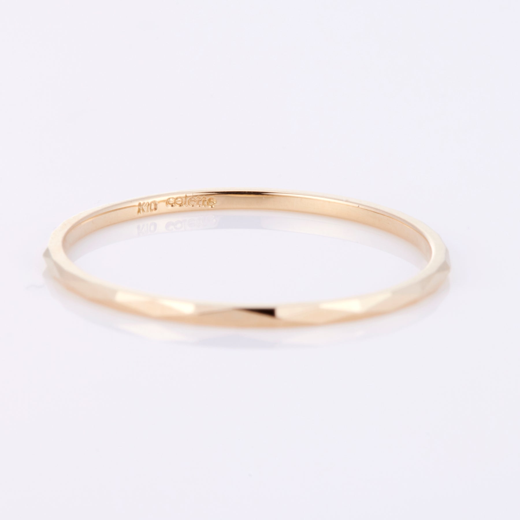 シンプルで華奢なデザインのイエローゴールドのリング。リングの表面に細やかなカットが施されているので、角度が変わるたびキラキラと輝きます。お好きな模様のリングで重ね付けされても素敵です。1本ではもちろん、リングの重ね付けにも活躍しそうです。
